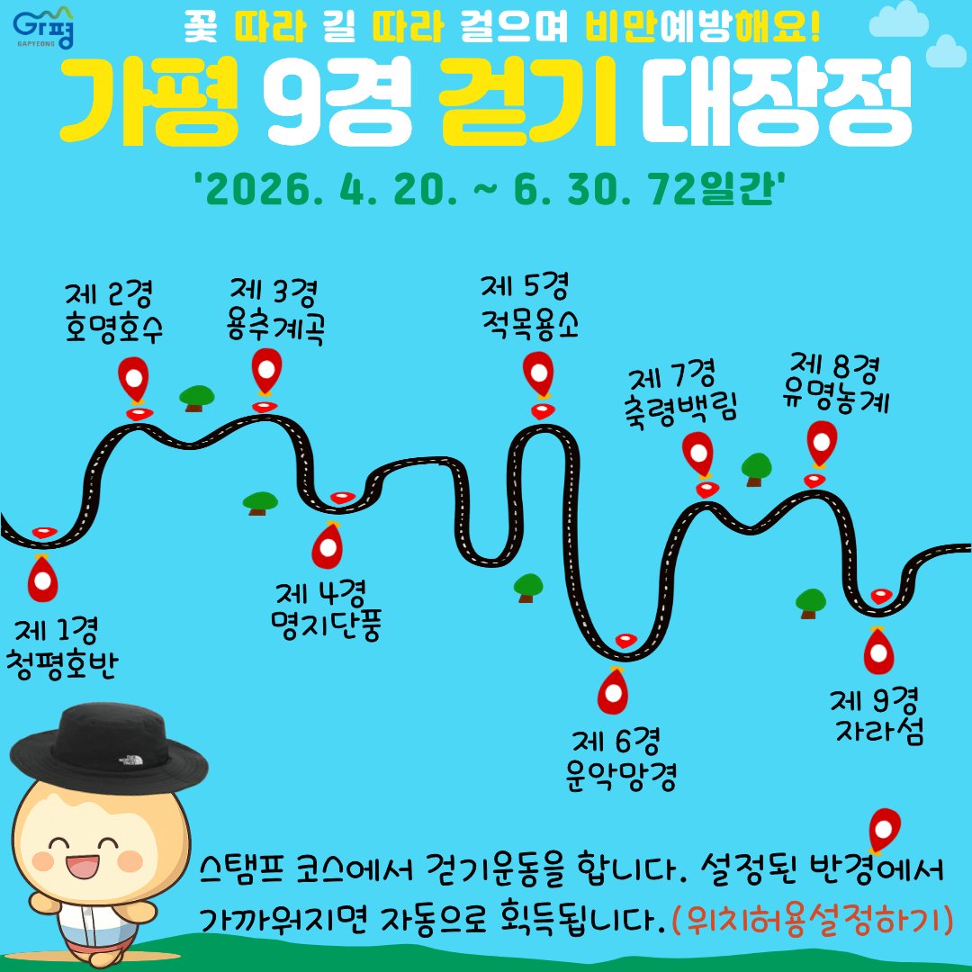 가평군이 군민 건강 증진을 위해 ‘2026 가평 9경 걷기 대장정’을 20일부터 시작한다.가평군 보건소는 군민들의 비만 예방과 걷기 실천율을 높이기 위해 이번 프로그램을 마련했다고 15일 밝혔다. 모집인원은 19세...