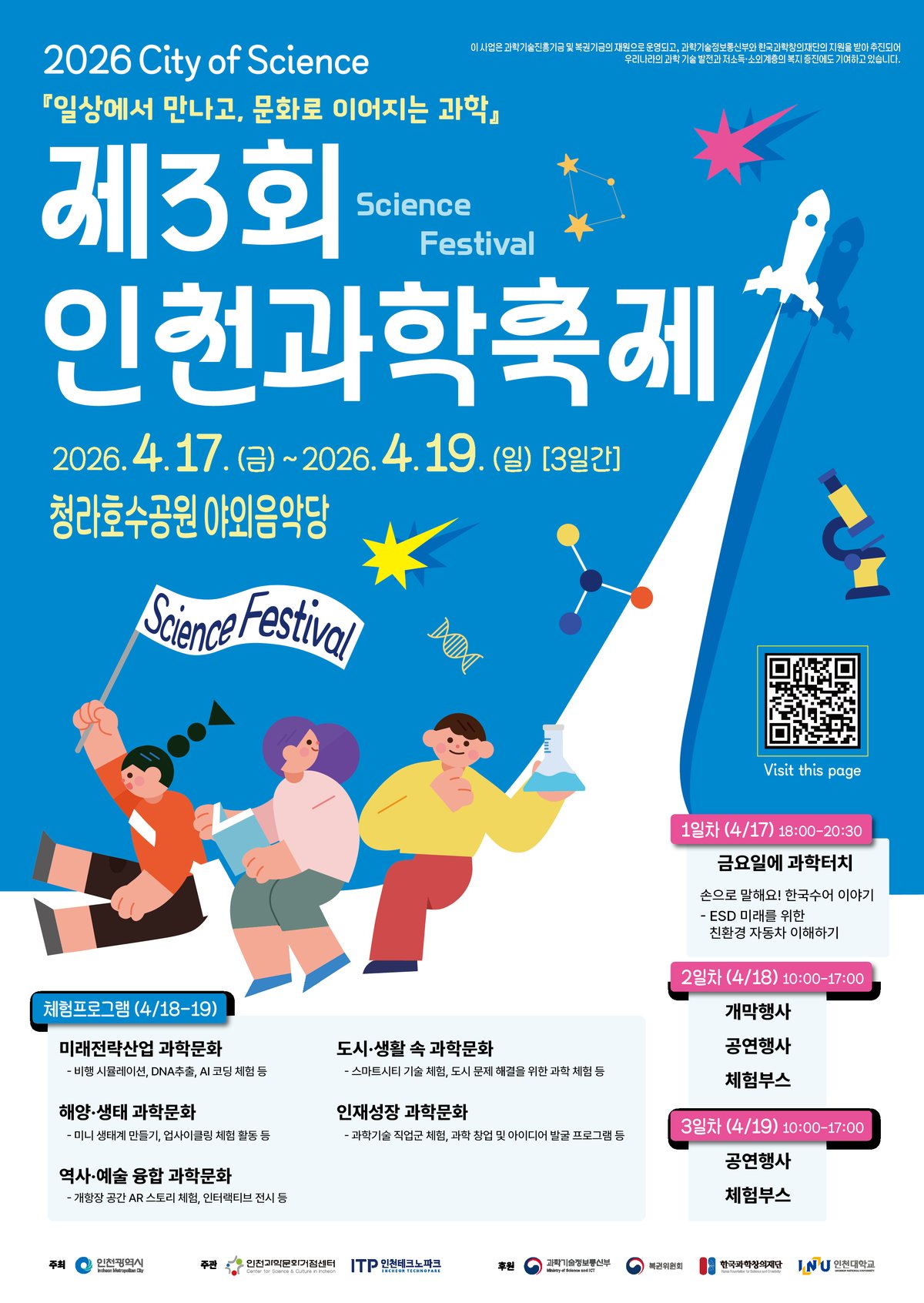 인천시가 4월 과학의 달을 맞아 시민들을 위한 풍성한 과학문화 행사를 연다. 17일부터 19일까지 청라호수공원과 인천어린이과학관에서 다채로운 체험형 축제가 펼쳐질 예정이다.이번 행사는 제59회 과학의 날을 ...