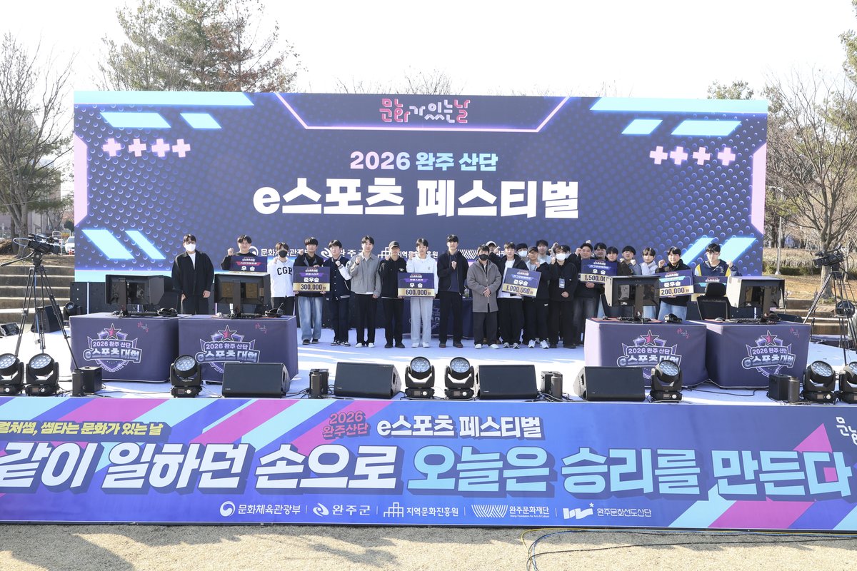 완주군 둔산공원에서 '2026 완주 산단 e스포츠 페스티벌'이 성황리에 막을 내렸다.이번 행사는 완주문화재단이 주최, 근로자와 지역 주민이 함께 즐기는 문화 축제로 기획됐다. e스포츠 대회는 물론 음악 공연, 체험 프로그램 등 다채로운 콘텐츠로 지역 사회에 활력을 불어넣었다는 평가다.특히, e스포츠 대회 예선에는 약 230명이 참가해 뜨거운 열기를 보였다. 행사 당일에는 e스포츠 대회와 '완주문화선도산단 쉼표 콘서트' 관람객을 포함, 약 5천여 명이 현장을 찾아 축제를 즐겼다.둔산공원 특설무대에서는 리그오브레전드, 브롤스타즈, 스타크래프트, FC온라인 총 4개 종목 결승전이 펼쳐졌다. 치열한 경쟁과 함께 열띤 응원전이 펼쳐져 현장 분위기를 고조시켰다.완주지역 근로자들은 스타크래프트 전 프로게이머 홍진호, 이윤열과 함께 이벤트 경기를 치르며 특별한 추억을 만들었다. 일상의 스트레스를 해소하는 즐거운 시간이었다는 후문이다.피크닉 쉼터, 체험 프로그램, 푸드트럭, 어린이 놀이시설 등 다양한 부대 프로그램도 운영됐다. 가족 단위 방문객들의 높은 참여를 이끌어냈다.'완주문화선도산단 쉼표 콘서트'에는 가수 변진섭, 전영록, 박강성 등이 출연, 멋진 공연을 선보였다. 축제 분위기를 한층 끌어올렸다.축제의 마지막은 화려한 불꽃놀이가 장식했다. 늦은 밤, 밤하늘을 수놓는 불꽃에 참가자들은 환호했다.FC온라인 우승자와 스타크래프트 우승팀은 모두 완주 거주 근로자였다. 한 우승자는 "내가 살고 있는 완주에서 열린 대회에서 우승하게 되어 매우 뜻깊다"며 "앞으로도 근로자들이 함께 즐길 수 있는 문화행사가 지속적으로 이어지길 바란다"고 소감을 밝혔다.유희태 완주문화재단 이사장은 "이번 페스티벌은 근로자와 지역 주민이 함께 참여하는 문화축제를 성공적으로 선보인 사례"라며 "앞으로도 다양한 문화 프로그램을 통해 완주 지역에 활력을 더하고 지역주민과 근로자 모두가 즐길 수 있는 문화 환경을 조성해 나가겠다"고 말했다. -