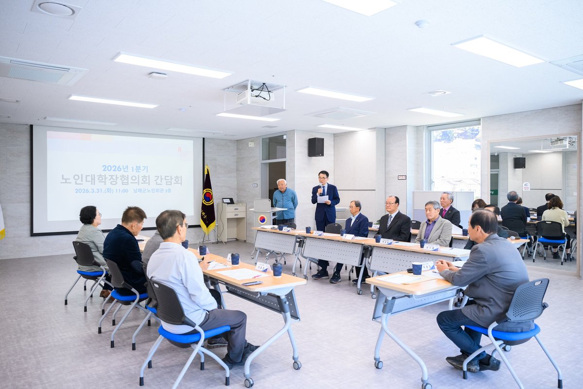 남해군 노인대학장협의회가 지난 3월 31일, 군내 13개 노인대학장이 참석한 가운데 간담회를 열고 노인대학의 상호 발전과 활성화 방안을 논의했다.노인회관 2층 교육실에서 진행된 이날 간담회에서는 2026년 신임 노인대학장 소개와 함께, 노인대학 운영 활성화를 위한 다양한 의견이 오갔다. 특히 지역사회 봉사 방안과 정보 교류의 중요성이 강조됐다.박종업 협의회장은 “지역사회를 위해 늘 봉사하는 마음으로 노인대학을 이끌어오신 학장님들께 감사드린다”며 “정보를 서로 교류하고 협의를 통해 좋은 방안을 창출하는 시간이 되길 바란다”고 말했다.장충남 남해군수는 노인대학의 역할에 대한 존경과 감사를 표했다. 장 군수는 “남해군 어르신들이 행복한 여가생활을 보내는 데 가장 크게 기여하는 곳이 노인대학”이라며 “어르신들이 건강하게 여가생활을 즐길 수 있도록 노력해달라”고 당부했다.현재 남해군에는 13개의 노인대학이 운영 중이며, 1562명의 학생이 등록하여 활발하게 참여하고 있다. 특강, 노래교실, 서예, 건강체조, 민요장구, 요가 등 다채로운 교육 프로그램이 제공되고 있다.남해군은 앞으로도 노인대학 운영을 적극 지원하여 어르신들의 건강한 노후생활을 돕는다는 방침이다. -
