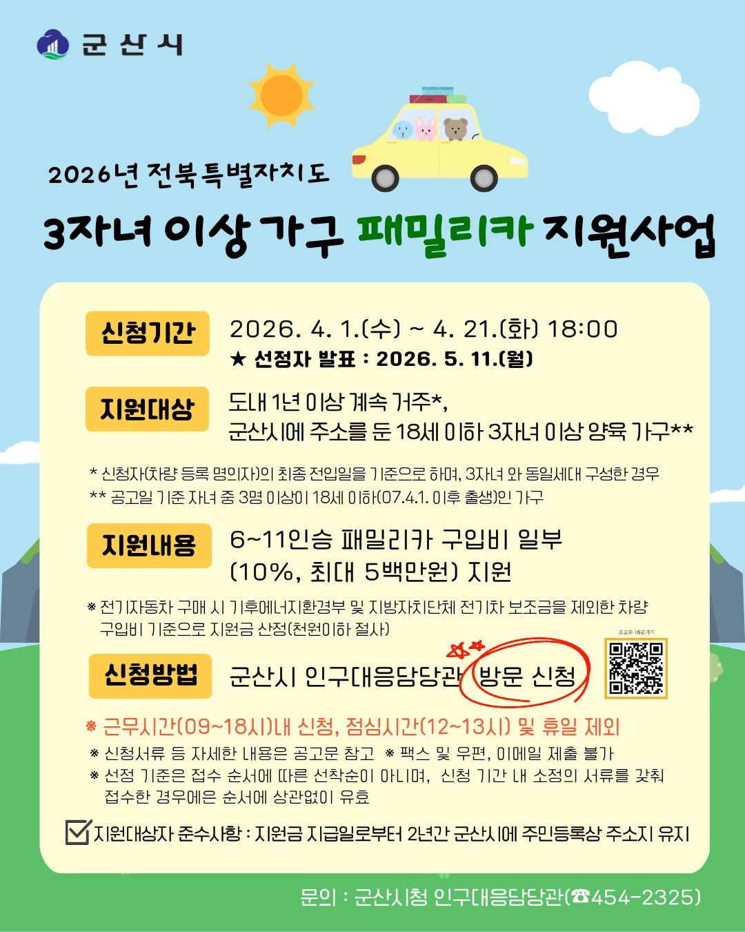 군산시는 다자녀 가구의 경제적 부담을 완화하고 이동 편의를 제공해 저출생 위기를 극복하고자 ‘2026년 전북특별자치도 3자녀 이상 가구 패밀리카 지원사업’ 참여자를 모집한다고 밝혔다.이번 사업은 전북자치도 내에 1년 이상 계속 거주하면서 군산시에 주소를 둔 18세 이하의 자녀 3명 이상을 양육하는 가구를 대상으로 하며 공고일 기준 자녀 중 3명 이상이 2007년 4월 1일 이후 출생한 경우에 신청할 수 있다.지원 대상으로 선정된 총 30가구에게는 6~11인승 패밀리카 신차 구입비의 10%, 가구당 최대 500만원까지 지원금이 지급된다.지원 가능한 차량은 2026년 1월 1일 이후 계약하고 공고일 이후 신규로 등록된 국산 승용 또는 승합자동차에 한하며 전기자동차를 구매할 경우에는 기존의 전기차 보조금을 제외한 실제 차량 구입비를 기준으로 지원금이 산정된다.다만 공고일 기준 가족 구성원이 7년 이내의 패밀리카를 이미 보유하고 있거나, 지방세를 체납 중인 경우 등은 지원 대상에서 제외된다.또한 5인승 차량을 2대 이상 보유했거나 7년이 경과한 패밀리카를 보유한 가구는 지급 신청 전까지 해당 차량을 매도하는 조건으로 지원받을 수 있다.사업 참여를 희망하는 시민은 4월 21일 오후 6시까지 군산시청 인구대응담당관을 직접 방문해 신청서와 관련 증빙서류를 제출해야 하며 팩스나 우편 및 이메일 접수는 받지 않는다.대상자 선발은 접수 순서가 아닌 항목별 배점 기준에 따른 고득점순으로 진행되며 6세 미만 자녀 수와 막내 자녀 연령, 군산시 거주 기간 등을 종합적으로 심사해 오는 5월 11일 군산시 홈페이지를 통해 최종 발표할 예정이다.최종 선정된 가구는 차량 등록 후 2개월 이내에 지원금을 신청해야 하며 지원금을 받은 후에는 2년간 도내 거주 및 차량 운행 의무를 준수해야 한다.시 관계자는 “이번 사업이 체감도 높은 정책으로서 다자녀 가정에 실질적인 도움이 되길 기대한다”며 “앞으로도 시민 맞춤형 인구정책을 통해 아이 키우기 좋은 군산을 만드는 데 최선을 다하겠다”고 강조했다. -