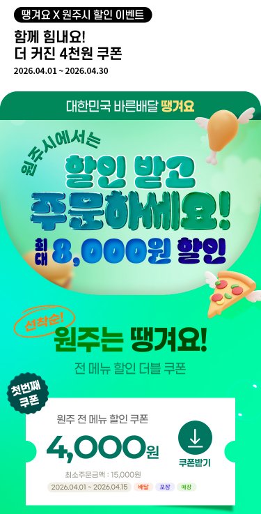 원주시가 4월부터 상생배달앱 ‘땡겨요’ 할인쿠폰 지원을 확대한다.최근 중동 지역의 불안정한 정세와 국제 유가 상승으로 인해 물가 상승 압박이 거세지는 상황이다. 이에 원주시는 소비를 촉진하고 시민들의 민...