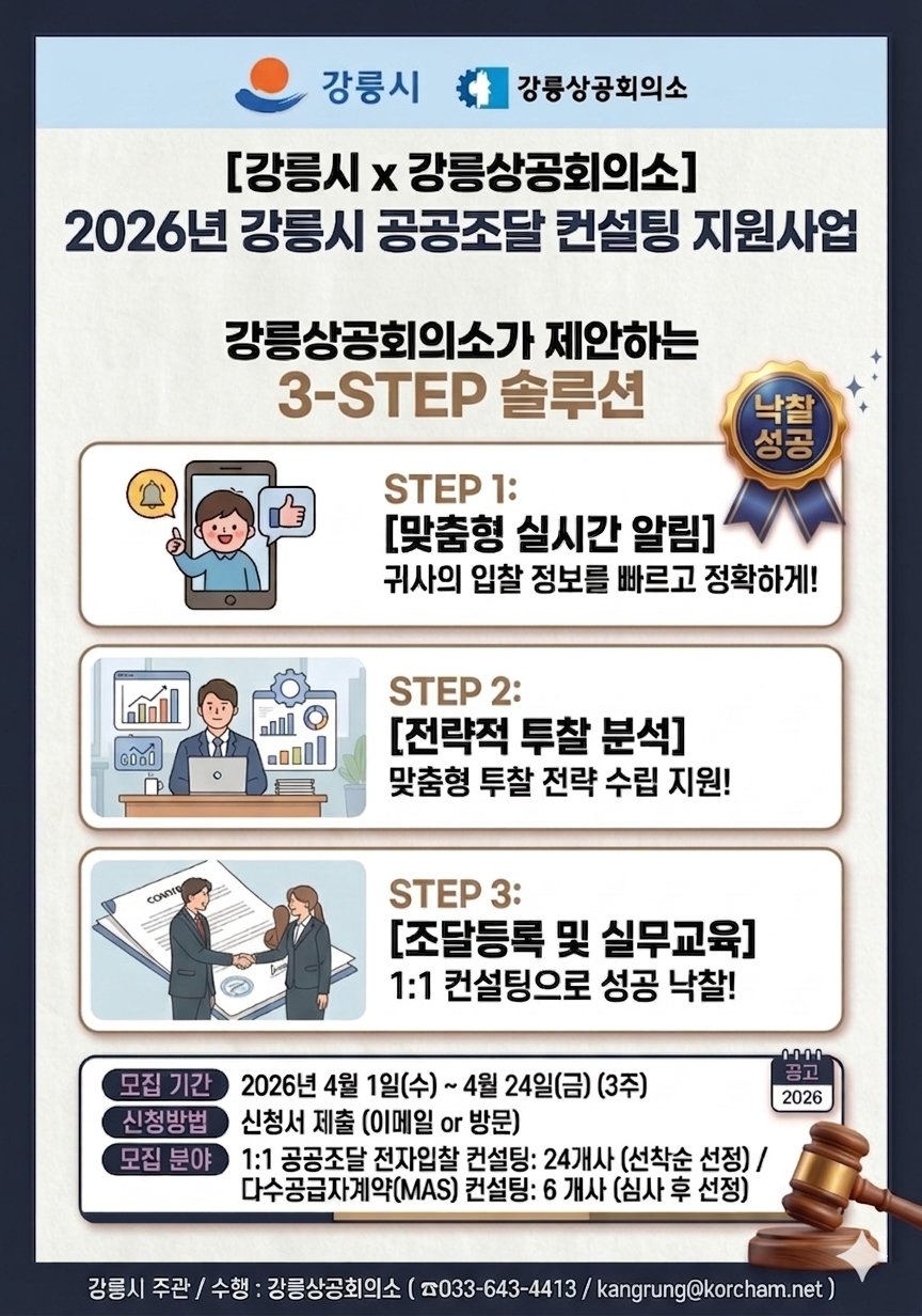 강릉시가 지역 내 중소기업의 판로를 넓히고 경쟁력을 높이기 위해 ‘2026년 공공조달 컨설팅 지원사업’을 시작한다.4월 1일부터 참여를 희망하는 기업을 모집한다. 이번 사업은 특히 공공조달 시장 진입에 어려움을 겪는 기업들을 위해 맞춤형 컨설팅을 제공하는 데 초점을 맞췄다.강릉상공회의소가 사업을 주관하며, 일대일 전자입찰 컨설팅과 다수공급자계약 컨설팅으로 나누어 지원한다.다수공급자계약 분야는 전문적인 검토가 필요한 만큼, 별도의 심사를 거쳐 지원 대상을 선정할 예정이다. 선정된 기업에게는 입찰 정보 실시간 알림, 투찰 전략 수립, 조달청 등록, 실무 교육 등 공공조달 전반에 걸친 무료 지원이 제공된다.신청 기간은 4월 1일부터 24일까지다. 참여 희망 기업은 신청서를 작성해 강릉상공회의소에 직접 방문하거나 이메일로 접수하면 된다.자세한 사항은 강릉상공회의소 회원총무과에 문의하면 된다.박찬영 경제진흥과장은 “공공조달 시장은 안정적인 판로 확보가 가능한 중요한 시장”이라고 강조했다.이어 “이번 컨설팅 지원사업을 통해 지역 중소기업의 공공시장 진입을 돕고, 실질적인 매출 확대와 경쟁력 강화로 이어질 수 있도록 적극적으로 지원하겠다”고 밝혔다. -