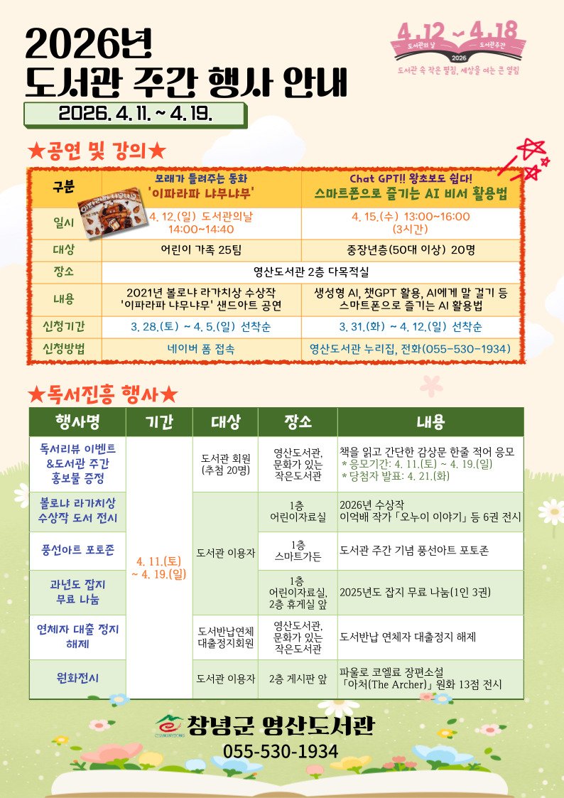 창녕군 영산도서관은 도서관 주간을 맞아 오는 4월 11일부터 19일까지 다양한 독서문화 행사를 운영한다고 밝혔다.4월 12일 오후 2시에는 모래가 들려주는 동화 '이파라파 냐무냐무'샌드아트 공연이 열...