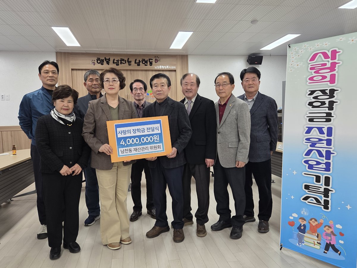 제천시 남천동재산관리위원회가 지역 인재 육성을 위해 따뜻한 마음을 전했다. 지난 26일, 남현동행정복지센터에 장학금 400만원을 기탁하며 지역 학생들을 응원했다.이번 장학금은 남천동에 거주하는 어려운 환...
