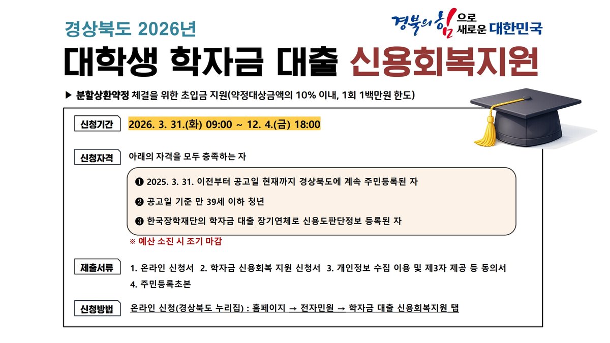경북도, 대학생 학자금 대출 이자 신용 회복 지원 확대
