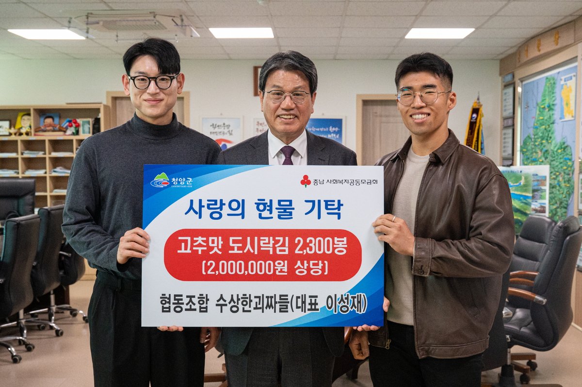 청양군이 지역 청년들로 구성된 ‘협동조합 수상한괴짜들’ 이 지역 어르신들을 위해 200만원 상당의 고추맛 도시락 김 2300봉을 기탁했다고 밝혔다.지난 27일 진행된 기탁식에는 이성재 대표와 유정재 이사가 참석...