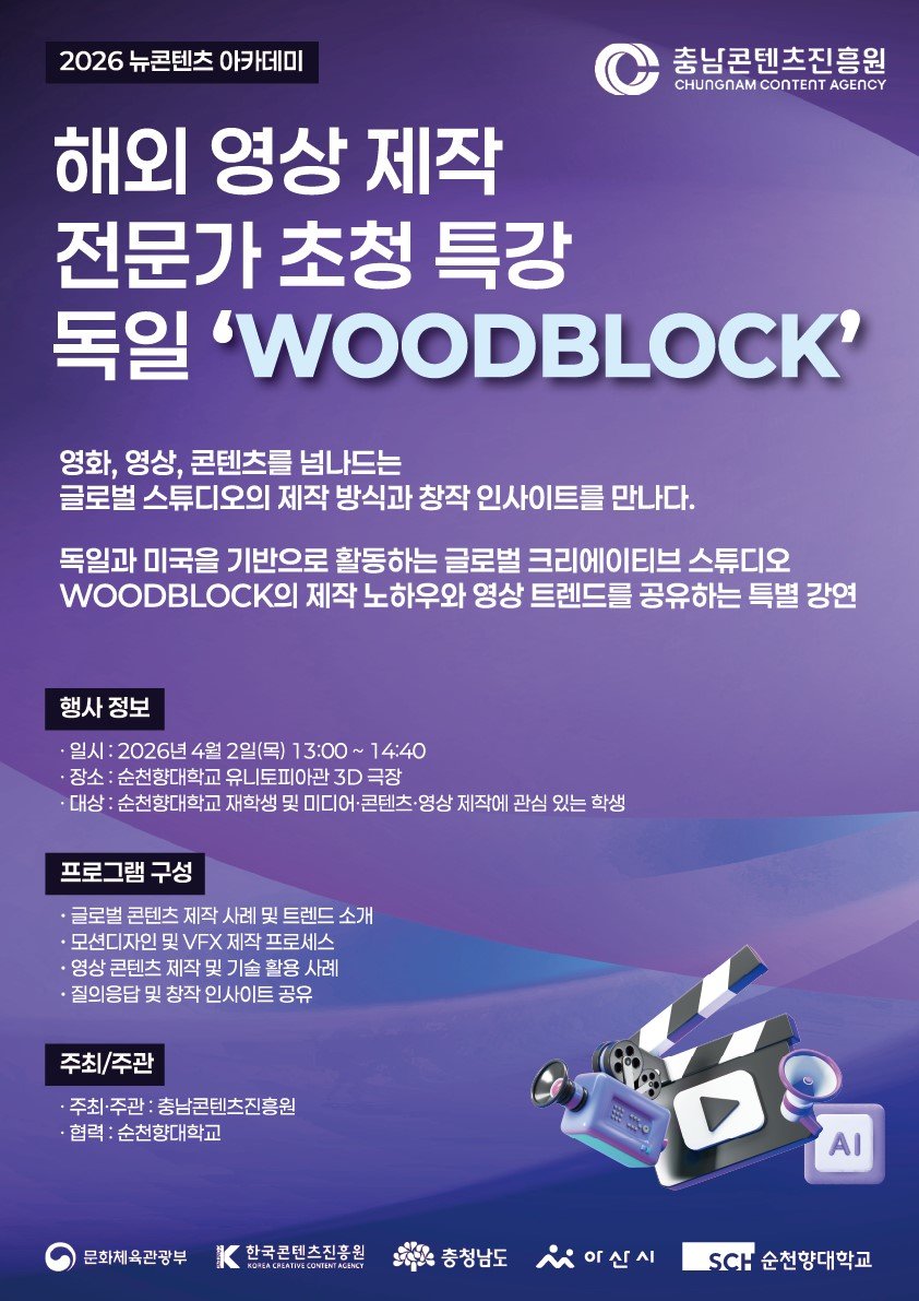 충남콘텐츠진흥원이 4월 2일 순천향대학교에서 '2026 뉴콘텐츠 아카데미'의 일환으로 글로벌 콘텐츠 제작 전문가 초청 특강을 개최한다.이번 특강에는 세계적인 크리에이티브 스튜디오인 독일 'Wo...