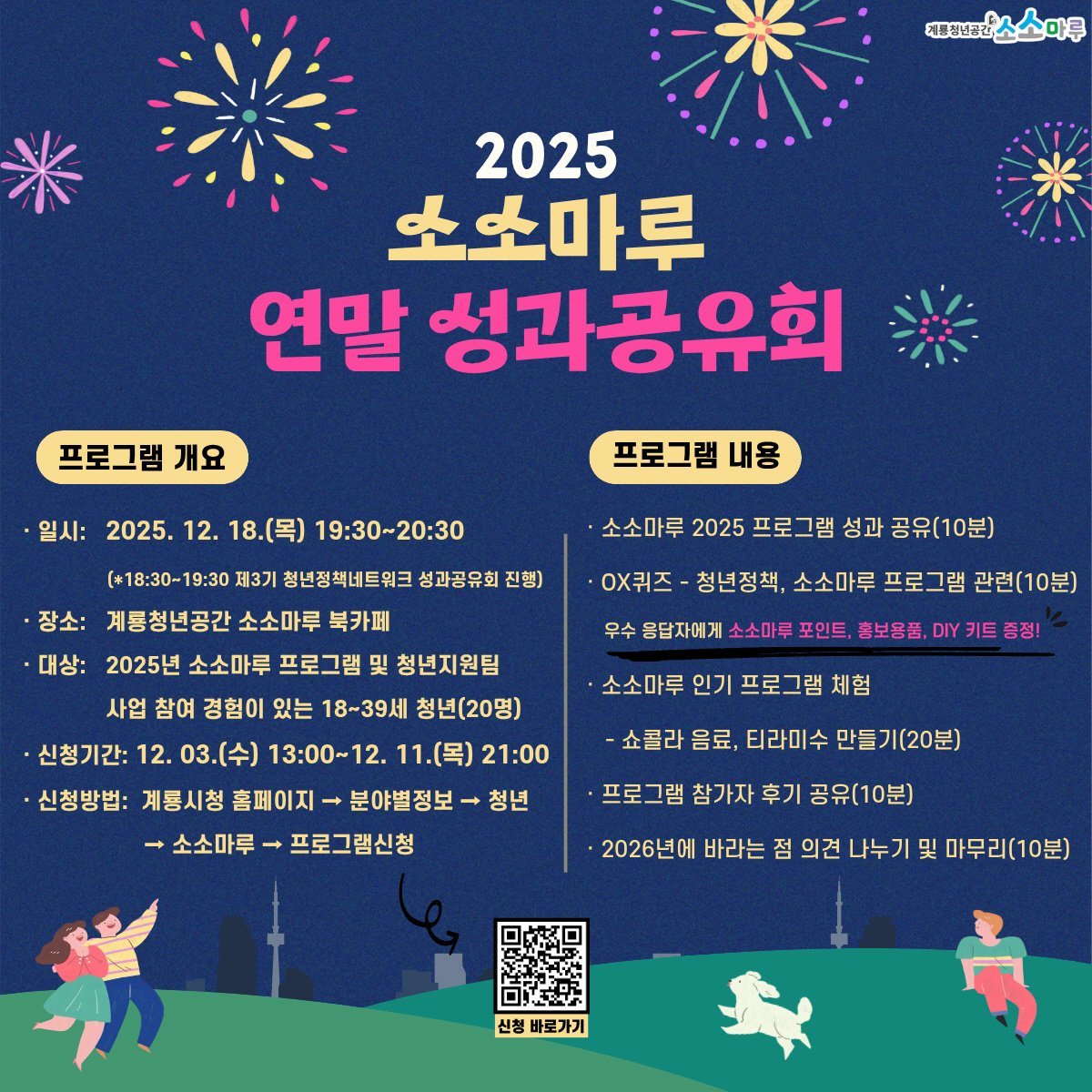 계룡시는 ‘2025 소소마루 연말 성과공유회’ 개최에 앞서 성과공유 참여자를 11일까지 모집한다고 밝혔다.이번 성과공유회는 소소마루를 중심으로 한 해 동안 다양한 프로그램에 참여한 청년들의 경험과 성과를 나...