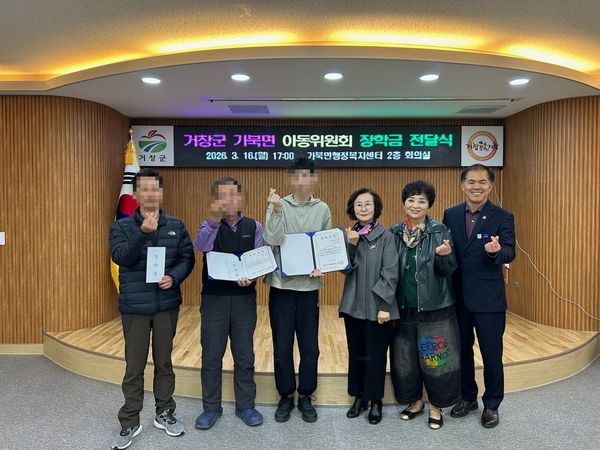거창군 가북면 아동위원회는 지난 16일 행정복지센터에서 지역 학생들을 위한 장학금 전달식을 개최했다.이날 전달식에는 장학생과 학부모, 가북면장, 아동 위원, 관계 공무원 등 9명이 참석한 가운데 성실한 학교생활을 이어가고 있는 지역 학생 2명에게 각 30만원씩 총 60만원의 장학금이 전달됐다.이번 장학금은 아동 위원들이 활동 과정에서 받은 수당을 모아 조성한 기금으로 마련됐으며 학업 의지를 가지고 성실하게 학교생활을 하고 있는 지역 학생들을 격려하고 응원하기 위해 매년 추진되고 있는 가북면 아동위원회의 장학사업이다.아동 위원들은 "학생들이 꿈과 희망을 키워가는 데 작은 보탬이 되기를 바란다"며 "앞으로도 지역 아이들이 밝고 건강하게 성장할 수 있도록 지속적인 관심과 지원을 이어 가겠다"고 말했다.신동범 가북면장은 "지역사회의 따뜻한 관심과 나눔이 학생들에게 큰 힘이 된다"며 "학생들이 안정적인 환경에서 학업에 전념하고 자신의 꿈을 펼쳐나갈 수 있도록 지역사회와 함께 노력하겠다"고 말했다.한편 가북면 아동위원회는 장학금 지원을 비롯해 어린이날 행사, 아동학대 예방 캠페인, 디딤씨앗통장 후원 등 다양한 활동을 통해 지역 아동의 건강한 성장과 복지 증진을 위해 힘쓰고 있다. -