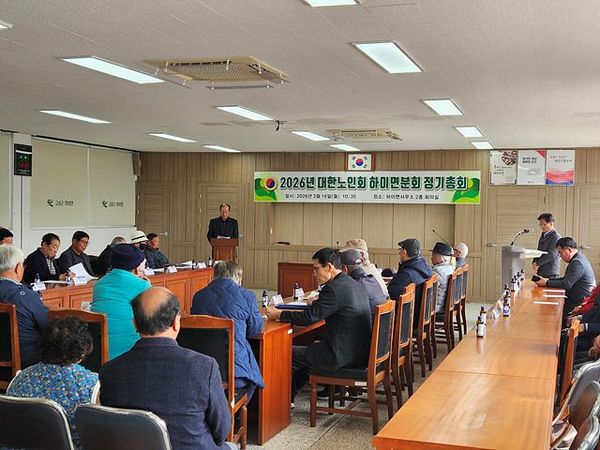 대한노인회 고성군지회 하이면분회가 지난 3월 16일 하이면사무소에서 정기총회를 열었다. 23개 경로당 회장 및 총무, 내빈 등 60여 명이 참석하여 2026년 분회 운영 방향을 논의했다.총회에는 최종림 대한노인회 고성군지회장, 최을석 고성군의회 의장 등이 참석하여 자리를 빛냈다. 특히 봉화골 경로당은 우수경로당으로 선정되어 표창을 받았다. 월흥경로당과 음촌경로당 신임 회장에게는 등록증이 전달됐다.총회에서는 2025년 활동 사항 보고와 감사 보고가 진행됐다. 2025년 결산안과 2026년 예산안 심의 및 의결도 이루어졌다. 기타 안건 토의도 이어졌다.김병호 하이면분회장은 “각 경로당 회장들이 노인회를 중심으로 지역 어른으로서 모범을 보였다”며 감사를 표했다. 덧붙여 “면민 화합을 위해 노력해 준 것에 감사하며, 올해도 분회 발전과 경로당 활성화를 위해 더욱 노력하겠다”고 말했다.정종국 하이면장은 “평소 면민 화합과 면정에 아낌없는 조언을 해주신 어르신들께 감사드린다”고 전했다. “어르신들을 포함해 면민 모두가 편안하고 행복한 하이면을 만드는 데 최선을 다하겠다”고 밝혔다. -