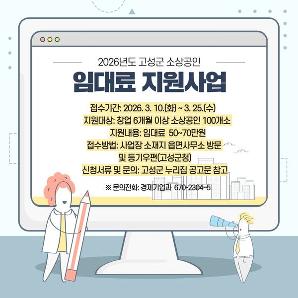 고성군이 고물가와 내수 부진으로 어려움을 겪는 소상공인을 위해 임대료 지원과 맞춤형 컨설팅을 동시에 추진한다.지난 3월 10일부터 시작된 이번 지원 사업은 소상공인의 경제적 부담을 덜고 자생력을 높이는 데 목적이 있다. 6개월 이상 고성군에서 사업장을 운영 중인 소상공인이 지원 대상이다.월 임대료 10만원 이상 사업장을 임차한 경우 신청할 수 있으며, 고성군은 신청 서류를 접수받아 적격 심사를 거쳐 지원 대상자를 선정할 계획이다. 선정된 소상공인에게는 상반기 내로 지원금이 지급될 예정이다.지원 제외 요건 등 자세한 사항은 고성군 누리집의 공고문을 통해 확인할 수 있다. 접수 방법 및 문의는 사업장 소재지 읍면사무소 또는 고성군청 지역경제과에서 가능하다.한편 경남신용보증재단은 '소상공인 맞춤형 컨설팅 지원사업'을 통해 고성군 소상공인 18개소를 대상으로 1:1 무료 컨설팅을 제공한다. 전문 컨설턴트가 직접 업체를 방문하여 세무, 마케팅, 점포 운영, 온라인 판로 개척 등에 대한 맞춤형 경영 진단과 실무 지원을 제공할 계획이다.컨설팅은 1회 4시간씩, 최대 4회까지 지원된다. 신청 기간은 2026년 11월 30일까지이며, 경남신용보증재단 홈페이지에서 신청할 수 있다.이주열 경제기업과장은 “경기 침체로 어려움을 겪는 관내 소상공인에게 임대료 지원과 전문 컨설팅이 실질적인 도움이 되길 바란다”고 말했다. 덧붙여 “앞으로도 지역 소상공인의 경영 환경 개선과 경쟁력 강화를 위해 다양한 맞춤형 지원책을 지속적으로 추진하겠다”고 밝혔다. -
