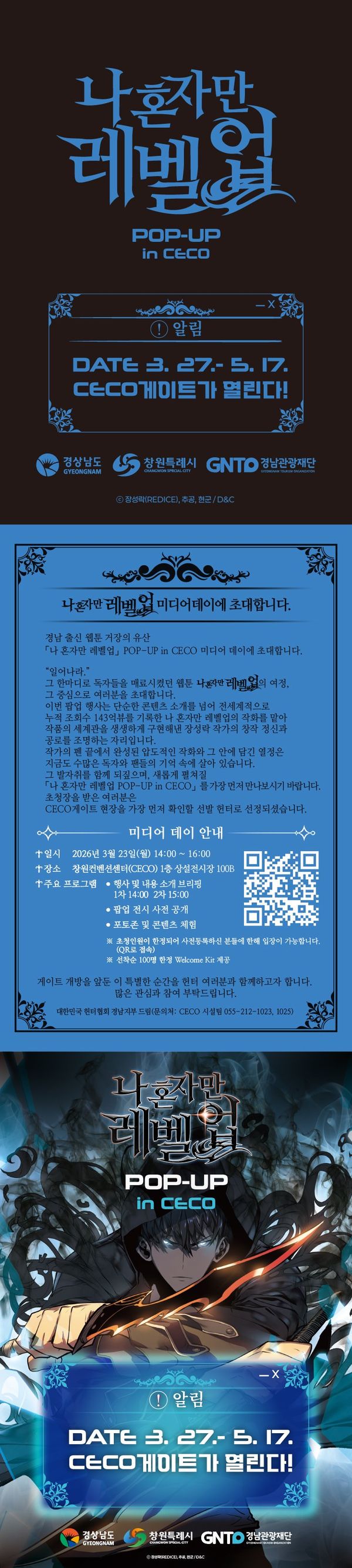 글로벌 누적 조회수 143억 회를 기록한 인기 웹툰 '나 혼자만 레벨업' 팝업스토어가 경남 창원에서 열린다.경상남도와 창원시, 경상남도관광재단은 3월 27일부터 5월 17일까지 창원컨벤션센터 1층 상설전시장에서 '나 혼자만 레벨업 POP-UP in CECO' 행사를 개최한다고 밝혔다. 이번 팝업스토어는 수도권 외 지역에서는 처음으로 개최되는 것이어서 더욱 의미가 깊다.웹툰 '나 혼자만 레벨업'은 추공 작가의 웹소설을 원작으로 2018년 연재를 시작했다. 이후 전 세계적인 인기를 얻으며 K-웹툰의 대표 주자로 자리매김했다. 최근에는 애니메이션과 게임으로 확장되며 지식재산권으로서의 가치를 높이고 있다.이번 행사는 특히 경남 거창 출신인 장성락 작가의 작품 세계를 집중 조명한다. 경상남도는 이번 팝업스토어를 통해 지역 출신 작가의 업적을 널리 알리고, 문화콘텐츠를 활용한 관광 활성화를 꾀한다는 방침이다.행사장 내부에는 다양한 볼거리가 마련된다. 전시존, 포토존, 작가존, 굿즈존, 체험존 등 다채로운 공간으로 구성된다. 특히 '작가존'에서는 장성락 작가의 생애와 작업 과정, 개인 소장품 등을 만나볼 수 있다.관람객들을 위한 체험 프로그램도 준비되어 있다. 스마트폰 증강현실 필터를 이용해 웹툰 속 '그림자 군단'을 소환하는 경험을 할 수 있다. 헌터증 제작, 스탬프 투어, 미션 게임 등 참여형 이벤트도 진행될 예정이다.공식 굿즈 판매 공간에서는 58종, 약 2800여 개의 라이선스 상품을 판매한다. 경남 대표 캐릭터 '벼리'를 활용한 지역 한정판 굿즈도 선보인다. 지역 업체와 협력하여 제작, 판매함으로써 지역 콘텐츠와 글로벌 IP의 협업 모델을 제시할 계획이다.한편, 본 행사에 앞서 3월 23일에는 미디어데이가 개최된다. 지역 언론과 콘텐츠 크리에이터를 초청하여 전시 콘텐츠와 체험 프로그램을 미리 공개하고, 도슨트 프로그램도 운영한다.김상원 경남도 관광개발국장은 “이번 팝업스토어는 지역 작가의 웹툰을 기반으로 한 새로운 형태의 문화 관광 콘텐츠”라며 “앞으로도 경남의 문화 브랜드 가치를 높이고 콘텐츠 산업이 관광객 유치로 이어지도록 육성하겠다”고 말했다. -