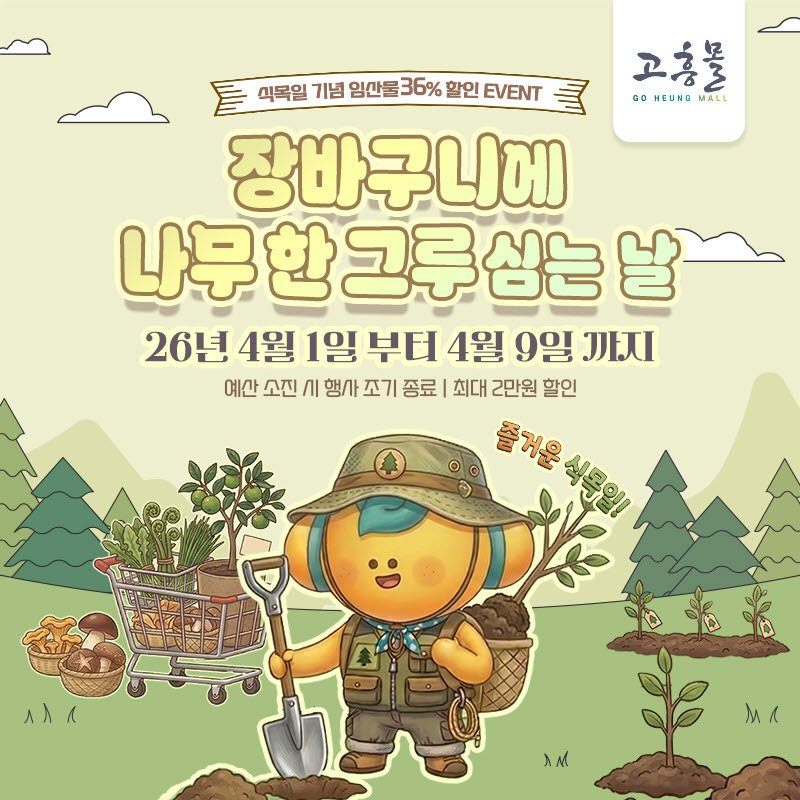 고흥군이 운영하는 온라인 쇼핑몰 고흥몰이 식목일을 맞아 특별한 기획전을 준비했다. 4월 1일부터 9일까지 진행되는 '장바구니에 나무 한 그루 심는 날' 기획전은 소비자들에게 다양한 혜택을 제공한다.이번 기획전은 식목일의 의미를 되새기고, 소비자들이 일상 속에서 자연과 산림의 가치를 느낄 수 있도록 기획됐다. 묘목, 꿀, 버섯, 나물류 등 다채로운 임산물을 최대 37% 할인된 가격에 만나볼 수 있는 기회다.소비자들은 이번 행사를 통해 과실수, 조경용 묘목 등 식재용 상품은 물론 봄철 제철 임산물인 표고버섯, 취나물, 고사리 등 나물류와 자연의 풍미를 담은 벌꿀 제품 등을 합리적인 가격에 구매할 수 있다.고흥군은 이번 행사가 가정에서는 건강한 식탁을 준비하는 데 도움을 주고, 산림자원 소비 확대를 통해 지역 임가 소득 증대에도 기여할 것으로 기대하고 있다. 특히 '장바구니에 나무 한 그루를 담는 소비가 곧 환경 보호와 지역 상생으로 이어진다'는 메시지를 전달하며 탄소중립 실천과 지속 가능한 소비문화 확산에 기여한다는 방침이다.고흥몰 관계자는 “식목일을 맞아 산림의 공익적 가치를 널리 알리고 임산물 소비 활성화를 통해 지역 임가에 실질적인 도움이 되기를 기대한다”고 밝혔다. 앞으로도 고흥몰은 계절과 소비 트렌드를 반영한 기획전을 통해 지역 특산물 판로 확대에 적극적으로 나설 계획이다.한편, 고흥몰은 2025년 누적 회원 수 5만 명 이상, 누적 매출 120억 원을 달성한 공공 온라인 쇼핑몰이다. 2026년에는 1인 가구 소용량 상품 확대와 정기배송 구독형 서비스 도입 등 생활 밀착형 유통 모델을 본격적으로 강화할 예정이다. -