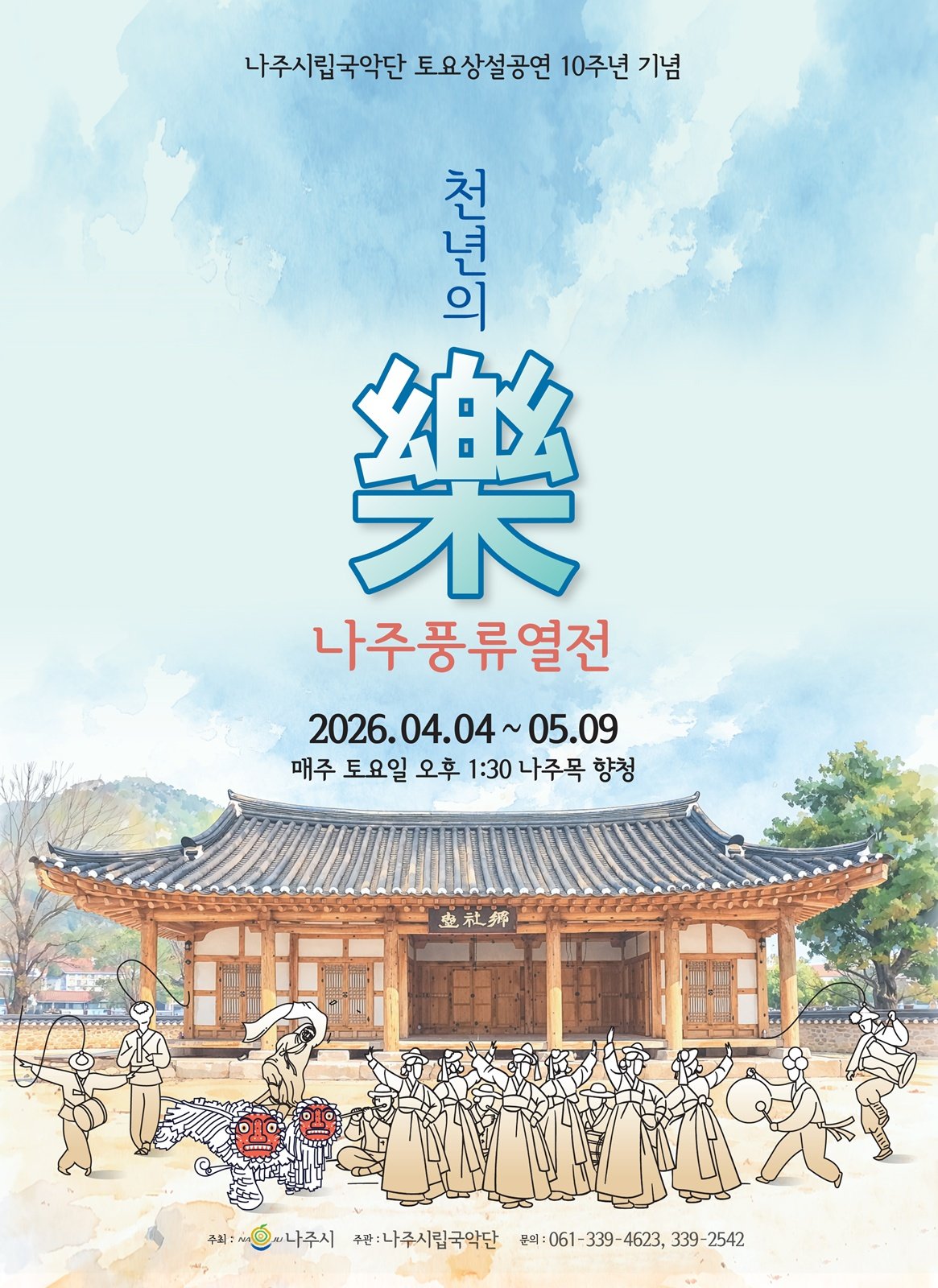 전남 나주시가 오는 4일부터 5월 9일까지 매주 토요일 나주목 향청에서 나주시립국악단 토요상설공연 '천년의 나주풍류열전'을 개최한다고 밝혔다.이번 공연은 '나주방문의 해'를 맞아 나주만의 전통문화 매력을 선보이기 위한 것이다.나주시립국악단의 대표 콘텐츠를 매주 토요일 오후 1시 30분부터 2시 30분까지 총 6회에 걸쳐 공연하며 나주 시민과 관광객 누구나 자유롭게 관람할 수 있다.또한 이번 토요상설공연은 전통과 현대가 어우러진 다채로운 국악 프로그램으로 구성된다.전통국악을 비롯해 국악관현악, 남도민요, 국악가요, 전통 및 창작무용 등 다양한 장르를 통해 시민들과 관광객이 국악을 보다 쉽고 흥미롭게 접할 수 있도록 기획됐다.주요 프로그램으로는 나주삼현육각과 춤, 나주향토민요 '도내기시암', 태평소와 사물놀이, 가야금 협주곡 '금성관', 나주읍성유람기, 다시들노래 등이 준비돼 있어 나주만이 줄 수 있는 예술적 감동을 선사할 예정이다.특히 5월 16일에는 나주목읍성문화축제와 연계한 특별공연으로 '마당극 나주삼색유산놀이'를 선보일 예정으로 지역 전통문화를 현대적으로 재해석한 공연을 통해 축제 분위기를 한층 끌어올릴 것으로 기대된다.이번 공연은 나주읍성권 나주목 향청에서 개최되어 역사와 문화가 어우러진 특별한 공연 경험을 제공해 지역을 찾는 관광객들에게도 색다른 볼거리를 선사할 전망이다.나주시립국악단 윤종호 예술감독은 "이번 공연은 전통국악에 현대적 감각을 함께 담아 누구나 편안하게 즐길 수 있도록 구성했다"며 국악의 멋과 흥을 가까이에서 느끼는 특별한 시간이 되길 바란다"고 전했다. 나주시 관계자는 "2026년 나주 방문의 해를 맞아 '토요상설공연 나주풍류열전'이 나주의 소중한 문화 자산을 전국에 널리 알리는 계기가 되길 기대한다"며 "앞으로도 시민과 관광객이 함께 공감할 수 있는 공연을 지속적으로 선보이며 나주를 대표하는 문화예술 콘텐츠로 발전시켜 나가겠다"고 덧붙였다.다만 야외공연 특성상 우천 등 기상상황에 따라 공연을 연기하거나 취소할 수 있으며 변경 시 나주시청 홈페이지 등을 통해 안내할 예정이다. -