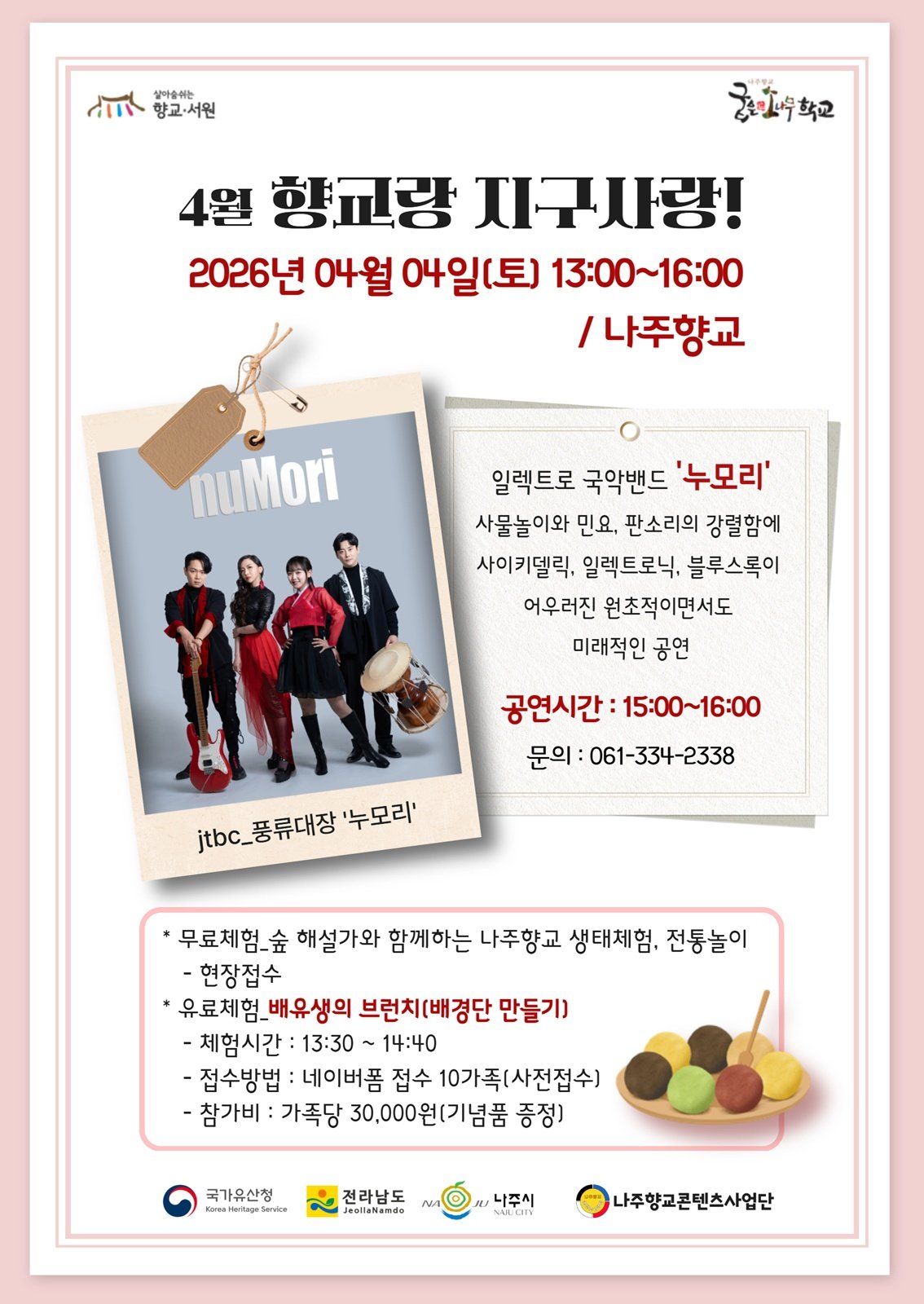나주향교가 전통문화와 환경 보호 메시지를 결합한 특별한 문화 체험 프로그램을 선보인다.나주시는 '나주향교 굽은 소나무학교'의 일환으로 오는 4일 오후 1시부터 나주향교 일원에서 '향교랑 지구사랑'을 개최한다고 밝혔다. 이번 행사는 시민과 관광객들에게 색다른 경험을 선사할 예정이다.이번 프로그램은 가족 단위 참여자와 일반인을 대상으로 기후변화 대응과 전통문화 체험을 융합한 것이 특징이다. 참가자들은 나주향교 생태 체험은 물론, 지역 특산물인 나주배를 활용한 '배유생의 브런치' 체험, 전통놀이 등을 즐길 수 있다.오후 3시에는 지역민과 관광객 100명을 대상으로 특별한 크로스오버 풍류 공연이 펼쳐진다. 공연에는 전통 국악에 록과 일렉트로닉 사운드를 결합한 '일렉트로 국악' 밴드 누모리가 참여해 흥겨운 무대를 선보일 예정이다.누모리는 사물놀이, 민요, 판소리를 기반으로 국악에 K-POP, K-Rock, 일렉트로닉 음악을 융합한 팀이다. 국내외 공연과 월드투어를 통해 한국 음악의 새로운 가능성을 제시하고 있다.'향교랑 지구사랑'은 오후 1시부터 4시까지 운영되며, '배유생의 브런치' 체험은 가족당 3만원의 유료 프로그램으로 진행된다. 자세한 사항은 '나주향교 굽은 소나무학교' 블로그 또는 전화 문의를 통해 확인할 수 있다.'나주향교 굽은 소나무학교'는 국가유산청과 전라남도, 나주시가 주최하고 나주향교콘텐츠사업단이 위탁 운영하는 지역 문화유산 활용 사업이다. 4월부터 11월까지 체험, 공연, 숙박형 프로그램 등 다채로운 콘텐츠를 선보일 계획이다.나주향교콘텐츠사업단 관계자는 “전통문화의 가치와 환경의 중요성을 함께 체험할 수 있는 프로그램을 통해 참여자들이 의미 있는 시간을 보내길 바란다”고 전했다. -