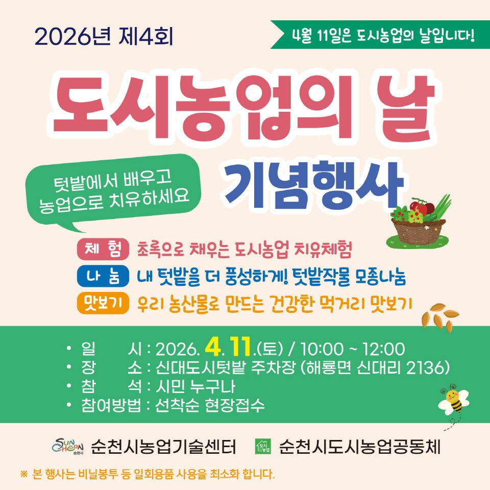 순천시가 지난 4월 11일 신대도시텃밭에서 ‘도시농업의 날’ 기념행사를 성공적으로 개최했다. 이번 행사는 도시농업의 공익적 가치를 널리 알리고 시민들의 참여를 장려하기 위해 마련됐다.기념식에는 많은 시민들이 참여해 텃밭 체험, 모종 나눔, 지역 농산물 홍보 등 다양한 프로그램에 참여하며 즐거운 시간을 보냈다. 특히 도시농업 공동체가 주도하는 행사로 진행되어 의미를 더했다.행사에 참여한 시민들은 도시농업을 통해 얻는 즐거움과 정서적 안정에 만족감을 표했다. 순천시는 이번 행사를 통해 도시농업이 단순한 농작물 재배를 넘어 환경 보호와 공동체 회복에 기여하는 중요한 활동임을 강조했다.순천시 관계자는 “이번 행사가 시민들의 도시농업에 대한 관심을 높이는 계기가 되었기를 바란다”고 말했다. 덧붙여 “앞으로도 도시농업 전문가 양성과 다양한 프로그램 운영을 통해 생활 속 도시농업 확산에 힘쓸 것”이라고 밝혔다.시는 앞으로도 도시농업 활성화를 위한 지원을 아끼지 않을 계획이다. 2026년 도시농업의 날 기념행사에도 많은 관심과 참여를 부탁한다고 전했다. -