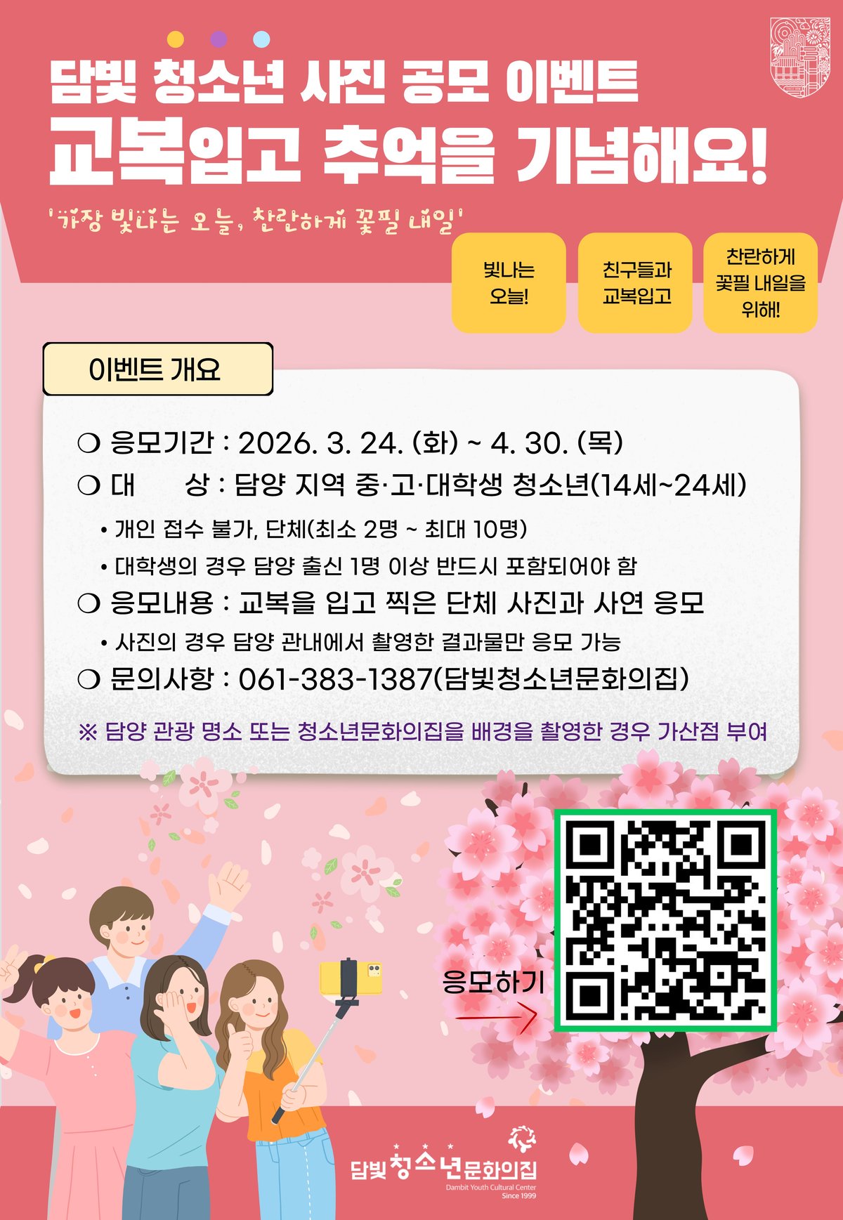 담빛청소년문화의집이 지역 청소년들을 대상으로 특별한 사진 공모 이벤트를 개최한다. '교복 입고 빛나는 지금을 기념하다'라는 주제로, 청소년들이 학창 시절의 소중한 추억을 사진으로 기록할 기회...