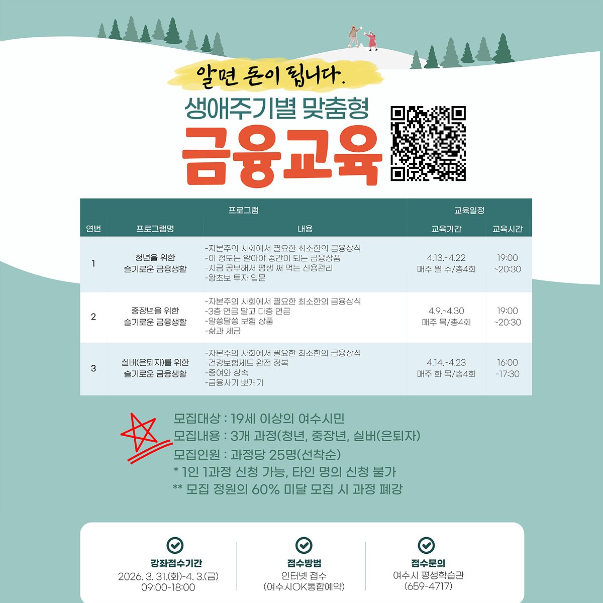 여수시가 시민들의 금융 이해도를 높이기 위해 생애주기별 맞춤형 금융 교육을 실시한다. 3월 31일부터 교육 참여자를 모집한다.이번 교육은 단순한 이론 교육을 넘어 금융 기초, 투자, 세금, 증여 등 실생활에 ...