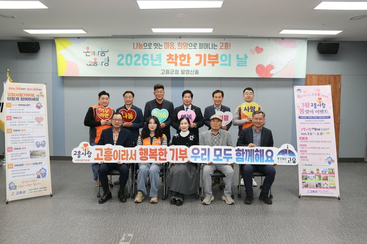 고흥군이 지난 26일 군청 팔영산홀에서 '착한 기부의 날' 행사를 열어 2200만원의 기부금을 모았다.이번 행사는 고향사랑기부금, 사회복지공동모금, 출산축복꾸러미 후원 등 3개 분야에서 총 6개 팀 10명이 참여했다. 지역 사회를 위한 자발적인 나눔이 돋보였다.분야별 기부금은 고향사랑기부금 1300만원, 사회복지공동모금 750만원, 출산축복꾸러미 후원 150만원으로 집계됐다. 특히 일부 참여자는 고향사랑기부 답례품을 사회복지공동모금에 재기부하며 나눔의 의미를 더했다.행사는 기부자 소개, 기부금 기탁, 기념 촬영 순으로 진행됐다. 참여자들은 환담을 통해 지역 발전에 대한 공감대를 형성했다.고흥군은 3월한 달간 고향사랑기부제 참여 확대를 위한 이벤트도 진행한다. 10만원 이상 기부자 중 100명을 추첨해 네이버 모바일 쿠폰을 제공한다.고향사랑기부제는 10만원까지 전액 세액공제 혜택이 있다. 10만원 초과 20만원 이하 구간은 44%, 20만원 초과분은 16.5% 세액공제가 적용된다. 기부금의 30% 이내에서 답례품도 받을 수 있다.군 관계자는 “착한 기부의 날을 통해 지역 나눔 문화가 확산하고 있다”고 말했다. 이어 “앞으로도 지속적인 홍보와 참여 유도를 통해 고향사랑기부제 활성화를 이어갈 계획”이라고 밝혔다.고향사랑기부제는 '고향사랑e음' 누리집, 전국 농협 창구, 민간 플랫폼을 통해 참여할 수 있다. -