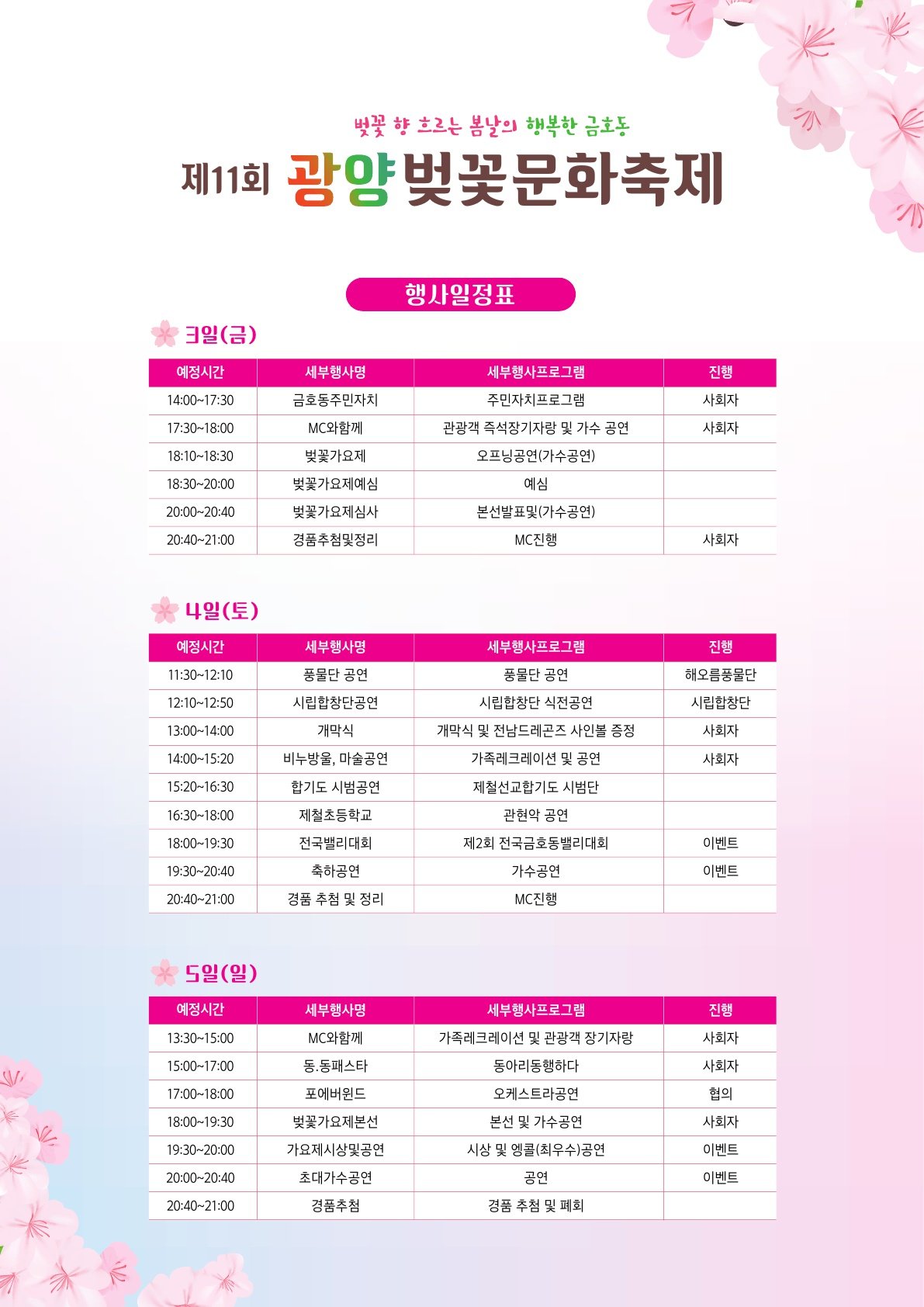 광양시 금호동이 4월 3일부터 5일까지 3일간 금호동 조각공원 일원에서 제11회 광양벚꽃문화축제를 연다.올해 축제는 '벚꽃향 흐르는 봄날의 행복한 금호동'이라는 슬로건 아래 지역 주민과 관광객 모두가 함께 즐길 수 있는 다양한 문화 행사로 채워질 예정이다. 특히 올해로 11회를 맞이하여 더욱 풍성한 볼거리를 제공할 계획이다.축제 기간 동안 개막식을 시작으로 전남드래곤즈 사인회와 사인볼 증정 행사가 열려 축구팬들의 기대를 모은다. 벚꽃가요제와 벨리댄스 대회, 제철초 관현악 공연 등 다채로운 공연이 펼쳐진다. 초대가수 무대와 가족 레크리에이션 등 남녀노소 누구나 즐길 수 있는 프로그램도 준비되어 있다.금호동의 11개 사회단체와 포스코 봉사단이 참여하는 봉사 부스도 운영된다. 방문객들은 부침개, 팝콘 뻥튀기 시식, 생맥주 시음 코너를 무료로 이용할 수 있다. 벚꽃 키링 및 비누 만들기 체험 등 다양한 무료 프로그램도 즐길 수 있다.광양의 대표적인 벚꽃 명소인 백운대 벚꽃길은 축제 기간 동안 화려하게 핀 벚꽃으로 장관을 이룰 것으로 보인다. 방문객들은 벚꽃길을 따라 산책하며 봄의 정취를 만끽할 수 있다.밤에는 벚꽃 경관 조명이 더해져 낮과는 또 다른 감성적인 분위기를 연출할 예정이다. 정종현 광양벚꽃문화축제추진위원장은 "이번 축제가 지역 주민과 관광객 모두에게 행복한 기억으로 남길 바란다"며 "안전하고 쾌적한 축제 운영을 위해 최선을 다하겠다"고 말했다. -