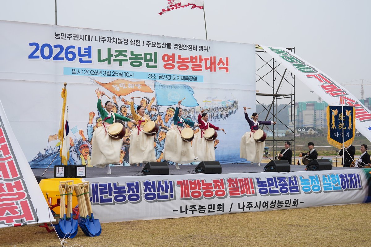 전남 나주시가 영농철을 맞아 농업인들의 화합을 도모하고 풍년 농사를 기원하는 영농발대식을 개최했다.지난 25일 영산강둔치체육공원에서 열린 ‘2026년 농업인 영농발대식’에는 지역 농업인과 시민 1500여 명이 참석해 성황을 이뤘다. 나주시는 이번 행사를 통해 한 해 농사의 시작을 알렸다.나주농민회와 나주시여성농민회가 공동으로 주관한 이번 행사는 단순한 축제를 넘어, 농업인들이 직면한 현실적인 어려움을 극복하고 미래 농업 발전을 위한 의지를 다지는 자리였다는 평가다.특히 최근 기후변화와 농자재 가격 상승, 농촌 고령화와 인력 부족 등 여러 난관 속에서 이번 발대식은 농업인들의 사기를 진작하고 지속 가능한 농업 발전을 모색하는 의미 있는 시간이 됐다.이날 행사는 풍물패의 흥겨운 길놀이 공연으로 시작을 알렸다. 나주시립국악단의 축하공연과 고천제가 이어지며 풍년을 기원하는 분위기를 고조시켰다.기념식에서는 농민회장과 여성농민회장의 대회사, 그리고 전농 광주전남연맹 의장의 격려사가 있었다. 농업 발전과 농민 권익 향상을 위한 결의문 낭독도 진행됐다.이후 ‘농업인 대동한마당’에서는 초대가수 공연과 체육 행사가 펼쳐져 참석자들의 큰 호응을 얻었다. 농업인들은 함께 웃고 즐기며 화합을 다지는 시간을 가졌다.강상구 나주시 부시장은 “어려운 여건 속에서도 묵묵히 지역 농업을 지켜가는 농업인들에게 깊은 감사를 드린다”고 말했다. 이어 “농업인들의 노력이 결실로 이어질 수 있도록 경쟁력 강화와 소득 안정 정책을 지속적으로 추진하겠다”고 약속했다.나주시는 앞으로도 농업인들의 목소리에 귀 기울이며, 실질적인 지원을 통해 농업 경쟁력을 강화해나갈 방침이다. -