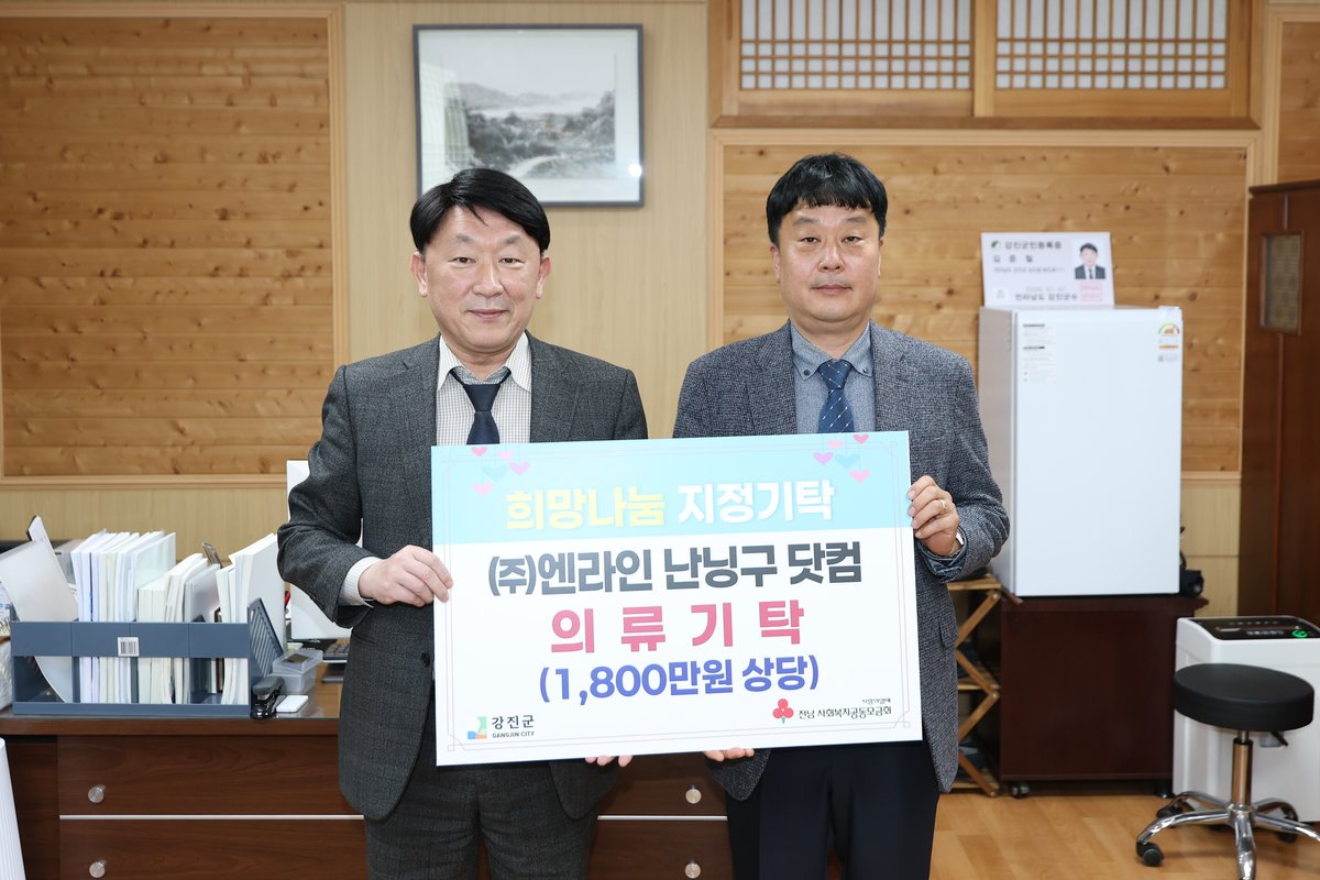 여성의류 전문업체 엔라인난닝구닷컴이 강진군 취약계층을 위해 1800만원 상당의 여성 의류 311벌을 기탁했다. 25일 진행된 기탁식에는 김준철 부군수, 강성봉 전북도의원, 강성국 건주이앤씨 대표 등이 참석했다.엔라인난닝구닷컴의 이번 기탁은 단순한 물품 전달을 넘어, 지역사회와의 상생을 위한 꾸준한 노력의 일환으로 풀이된다. 2014년부터 시작된 엔라인난닝구닷컴의 기부활동은 2025년 말 기준 약 23억 2천만원 상당에 달한다.강성국 대표는 “지역사회와 함께 성장해 온 기업으로서 강진군의 어려운 이웃들에게 조금이나마 도움이 되기를 바란다”며 지속적인 나눔 의지를 밝혔다. 기탁된 의류는 강진군 11개 읍 면의 저소득 취약계층과 사회복지시설에 전달될 예정이다.김준철 부군수는 엔라인난닝구닷컴에 감사를 표하며 “기탁해 주신 의류는 꼭 필요한 분들에게 잘 전달해 지역사회에 따뜻한 온기가 퍼질 수 있도록 하겠다”고 말했다.강진군은 앞으로도 민관 협력을 강화하여 나눔 문화 확산과 취약계층 지원에 힘쓸 계획이다. 엔라인난닝구닷컴의 꾸준한 사회공헌 활동이 지역사회에 긍정적인 영향을 미칠 것으로 전망된다. -