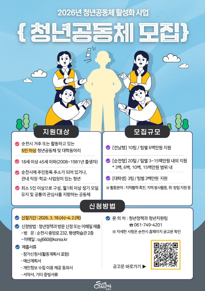 순천시가 청년들의 참신한 아이디어를 바탕으로 지역사회에 활력을 불어넣을 '2026년 청년공동체 활성화 사업' 참여팀을 모집한다.특히 올해는 지원 대상을 대학생 동아리까지 확대해 더욱 폭넓은 청년...