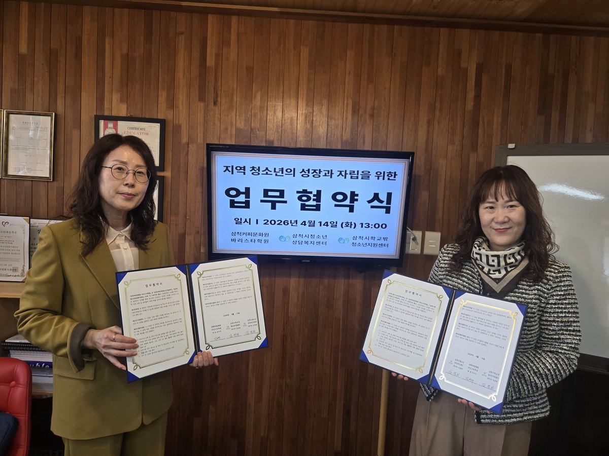 삼척시가 지역 청소년들의 진로 탐색과 직업 역량 강화를 위해 발 벗고 나섰다.삼척시청소년상담복지센터·삼척시학교밖청소년지원센터는 삼척커피문화원 바리스타학원과 업무 협약을 체결했다고 14일 밝혔다. 이...