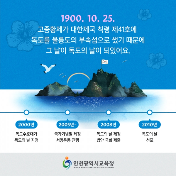 인천광역시교육청은 바른 역사의식 함양을 위해 독도의 날 카드뉴스를 모든 학교에 배부해 홍보를 강화하겠다고 밝혔다. 독도의 날은 1900년 10월 25일 고종황제가 대한제국 칙령 제41호를 통해 독도를 울릉도의 부속섬으로 기재한 것을 기념해 제정됐고 학교에서는 독도의 날 전에 독도교육주간을 운영한다. 이에 인천시교육청은 카드뉴스를 제작해 독도의 날을 홍보하고 독도교육자료를 일선 학교에 배포했다. 또한, 현장체험 중심의 독도교육을 위해 학생교육문화회관 내 독도체험관을 상시 운영하고 있다. 독도체험관의 전시는 ‘독도를 만나다’, ‘자연과 생태를 느끼다’, ‘역사의 진실을 보다’, ‘독도를 사랑하다’ 로 구성되어 있고 인천의 대표적인 섬인 백령도와 독도를 비교 전시해 특징을 살렸다. 2021년 독도체험관이 새롭게 리모델링된 이래 33,000명이 체험관을 방문·체험했고 학교 단체 프로그램 신청시 해설사가 배치되어 좀 더 자세한 해설과 더불어 체험해 볼 수 있다. 인천시교육청 관계자는 다양한 자원들이 있는 우리의 땅 독도를 함께 기억하고 함께 지키기 위해 교육자료 제작 및 홍보를 강화하겠다고 밝혔다. -
