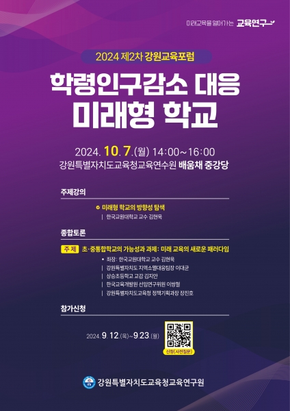 강원특별자치도교육청교육연구원은 7일 오후 2시, 강원특별자치도교육청교육연수원 배움채 중강당에서 2024년 제2차 강원교육포럼을 개최했다. 이번 포럼은 인구 감소와 지역 소멸 문제에 대응하기 위한 미래형 학교의 방향성을 탐색하기 위해 마련됐다. 포럼에는 강원특별자치도교육청 교직원, 지자체, 강원특별자치도민, 대학 관계자 등 200여명이 참석했다. 포럼은 ‘학령인구감소 대응 미래형 학교’를 주제로 강의, 종합토론, 질의응답 순으로 진행됐다. 주제 강의는 한국교원대학교 김현욱 교수가 △‘미래형 학교의 방향성 탐색’에 대해 진행했다. 이후 종합토론 시간에는 △한국교원대학교 김현욱 교수 △강원특별자치도 이대균 지역소멸대응팀장 △구래초등학교 김지안 교장 △한국교육개발원 이쌍철 선임연구위원 △도교육청 정책기획과 장진호 정책기획과장이 ‘초중통합학교 가능성과 과제, 미래 교육의 새로운 패러다임’을 주제로 토론을 진행하고 청중과의 질의응답 시간을 가졌다. 김은숙 원장은 “이번 포럼을 통해 학령인구 감소와 지역 소멸 문제에 대응하는 미래형 학교에 대한 논의의 장이 마련되기를 기대하며 강원교육의 지속 가능한 발전 방안의 방향을 찾는 기회가 되기를 기대한다”고 말했다. -