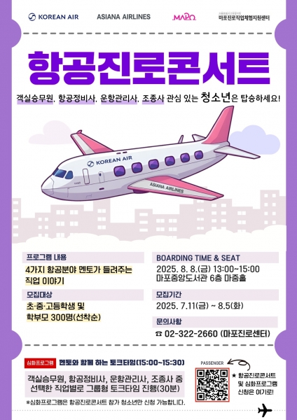 마포구는 청소년들에게 항공 분야에 대한 생생한 진로 정보를 제공하기 위해 8월 8일 오후 1시, 마포중앙도서관 6층 마중홀에서 ‘2025 항공진로콘서트’를 개최한다. 이번 콘서트는 대한항공과 아시아나항공의 ...