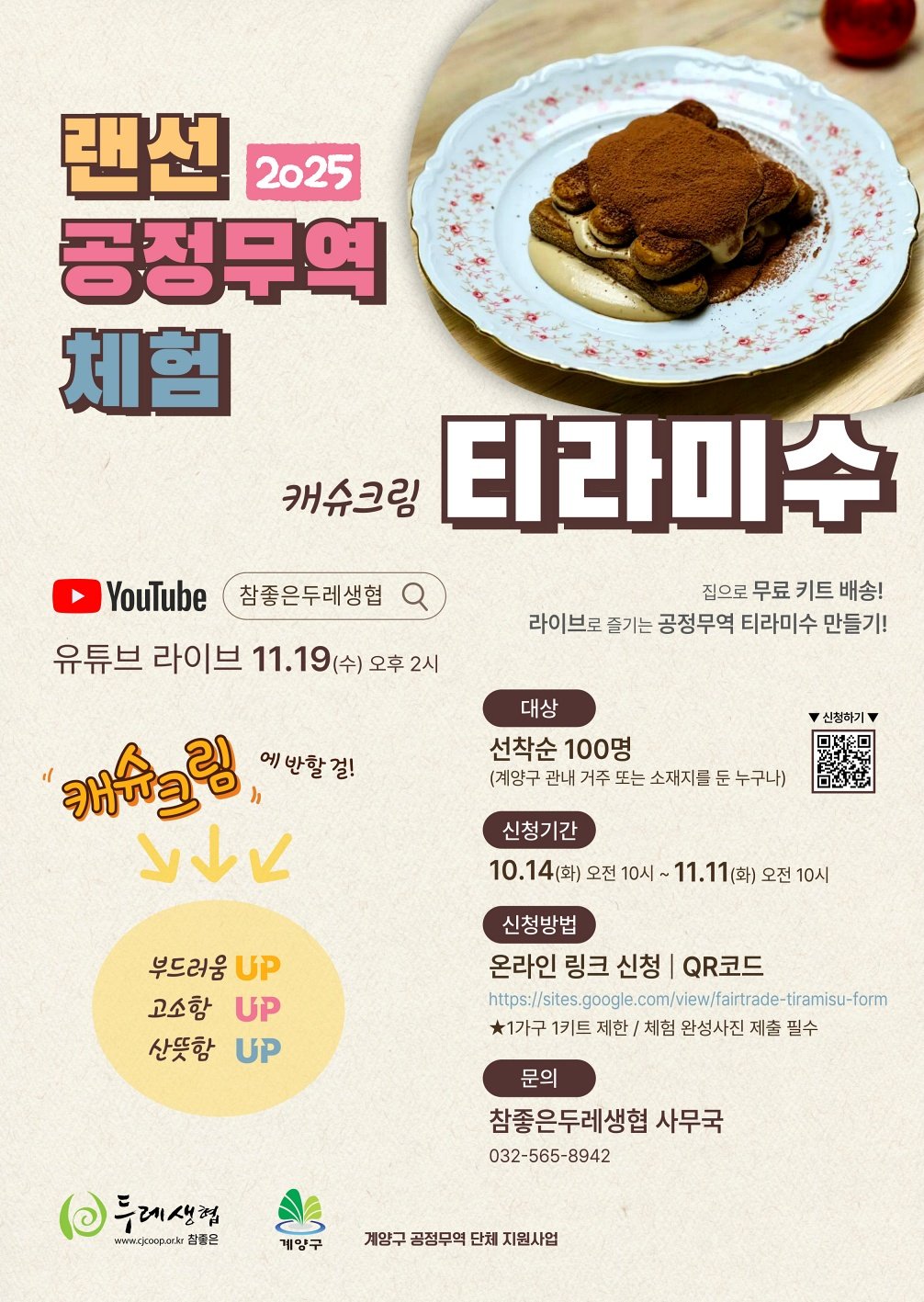인천광역시 계양구가 구민의 공정무역에 대한 관심과 참여를 높이기 위해 온라인 체험 행사를 개최한다. 구는 10월 14일부터 공정무역 재료를 활용한 ‘2025 랜선 공정무역 체험(캐슈크림 티라미수 만들기)’ 참여...