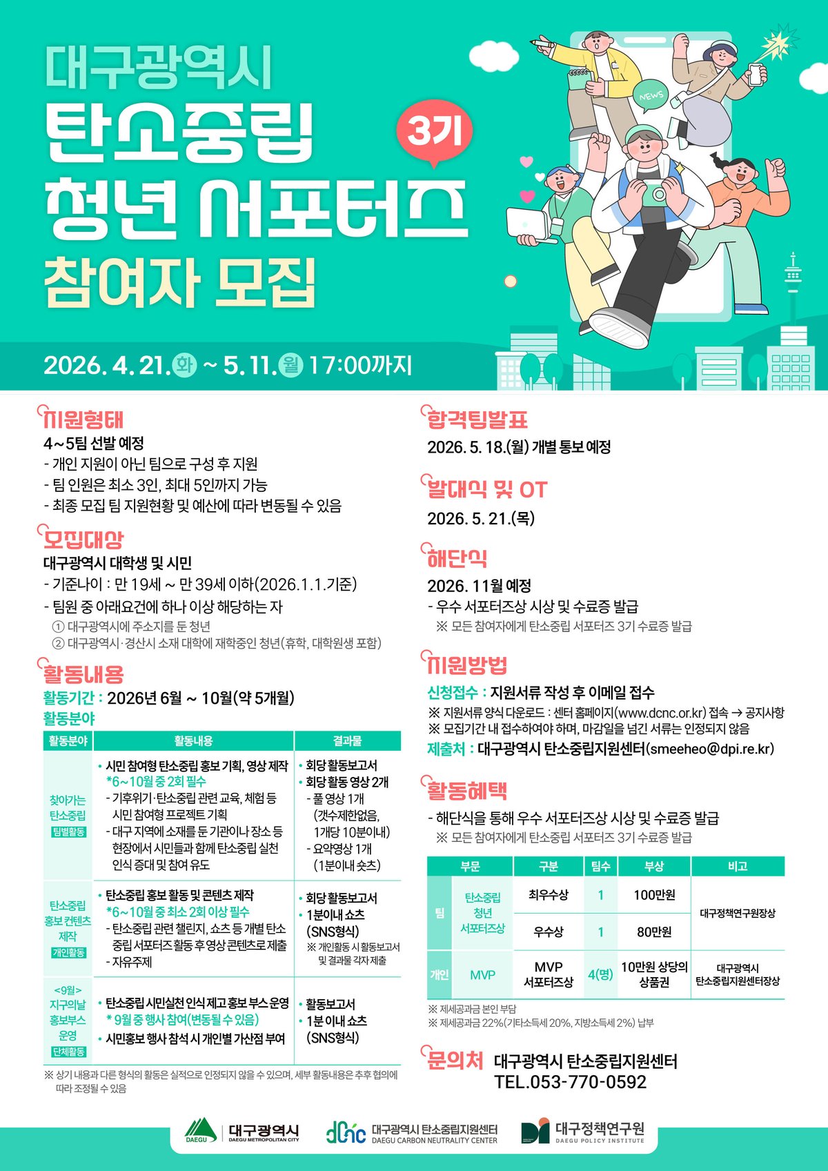 대구시가 기후위기 시대에 대응하고 탄소중립 실천 문화를 확산하기 위해 '탄소중립 청년 서포터즈 3기'를 모집한다. 만 19세 이상 39세 이하 대구 청년들이 창의적인 아이디어로 지역 사회 변화를 이...