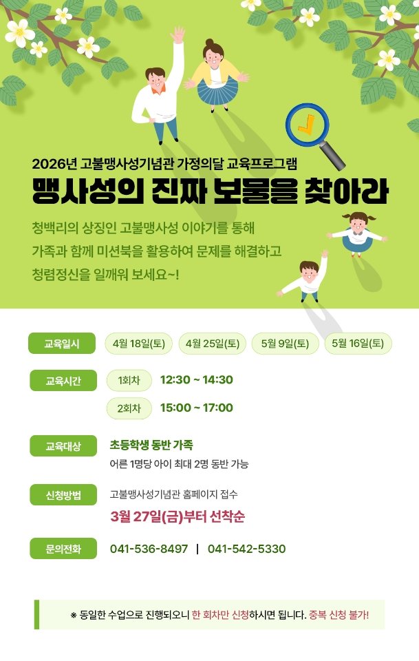 아산 고불맹사성기념관이 '가정의 달' 5월을 맞아 특별한 가족 교육 프로그램을 운영한다. '맹사성의 진짜 보물을 찾아라'는 탐방과 체험을 결합한 역사 교육 프로그램이다.4월 18일부터 5월...