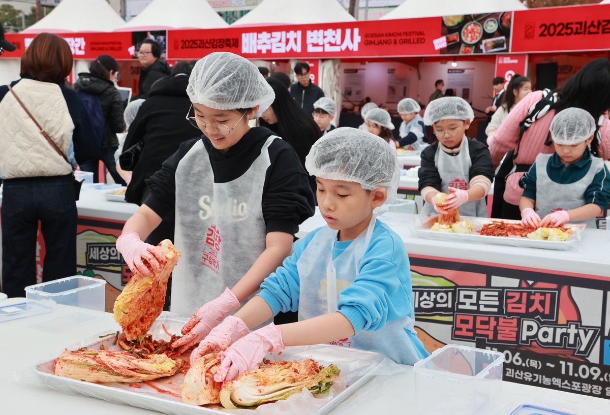 충북 괴산군 유기농엑스포 광장에서 열리고 있는 ‘2025 괴산김장축제’에서 8일 어린이 김장체험이 열려 눈길을 끈다.이날 체험에는 총 80명의 어린이들이 참가해 위생모와 앞치마를 착용한 채 직접 배추에 양념을...