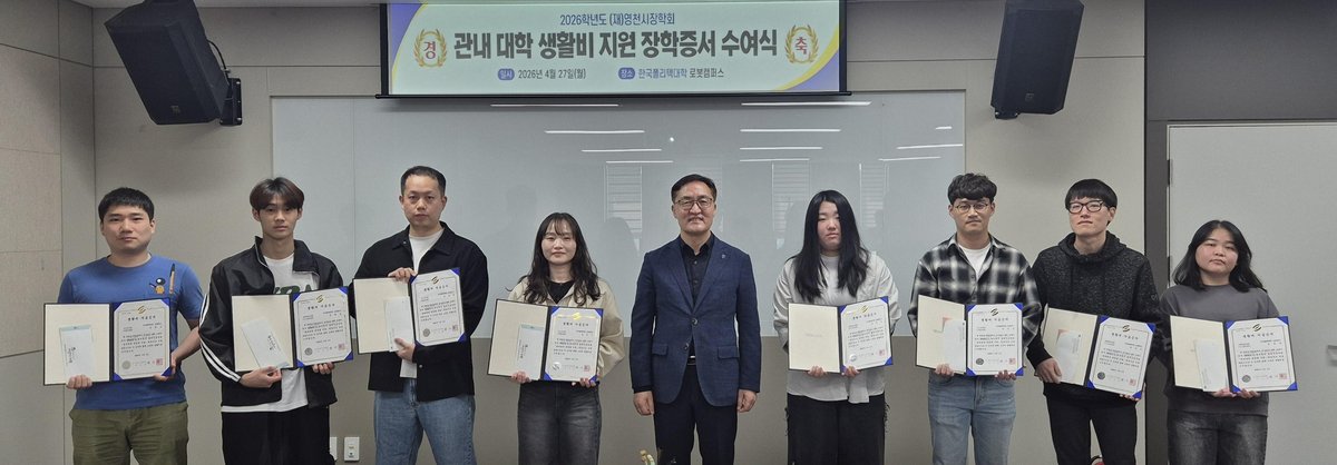 영천시가 지역 미래 인재 육성을 위해 한국폴리텍대학 로봇캠퍼스 학생들에게 생활비 장학금을 지원했다. 영천시장학회는 지난 27일 로봇캠퍼스 본관 대회의실에서 ‘2026년도 관내 대학 생활비 지원 장학증서 수...