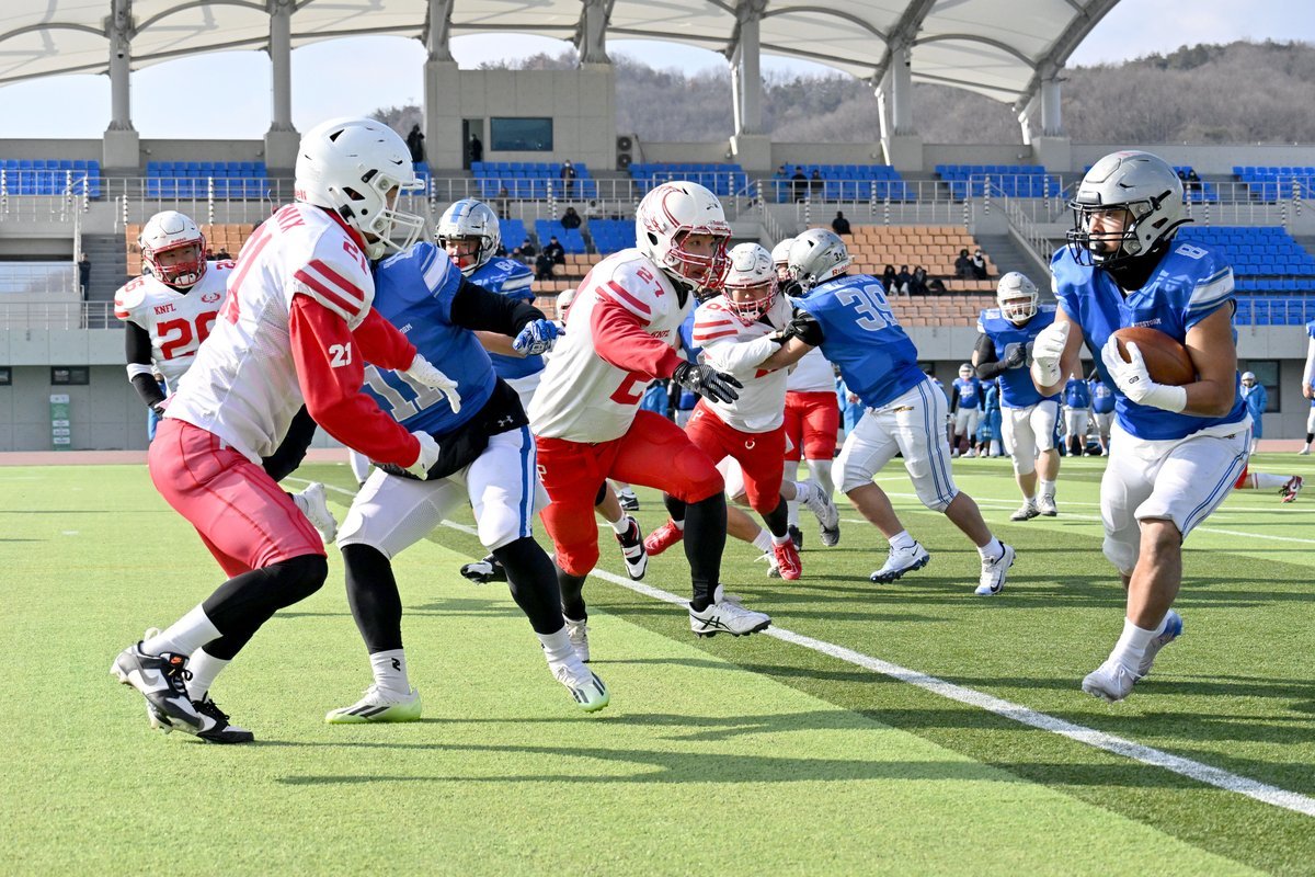 삼성 블루스톰이 제30회 한세실업배 KNFL 광개토볼 결승전에서 군위 피닉스를 37-21로 꺾고 우승을 차지했다.결승전은 지난 14일 정오, 대구광역시 군위군 군위종합운동장에서 열렸으며, 삼성 블루스톰은 공수 양면에서 안정적인 경기 운영을 선보였다.삼성 블루스톰은 조직적인 팀워크를 바탕으로 시종일관 안정적인 경기력을 유지하며 우승을 거머쥐었다. 이찬우 쿼터백은 정확한 패스와 침착한 경기 조율로 팀 승리에 크게 기여하며 대회 MVP에 선정되는 영예를 안았다.결승전은 유튜브를 통해 생중계되어 많은 미식축구 팬들의 관심을 받았으며, 현재 유튜브 다시보기를 통해 경기 전체를 시청할 수 있다.군위군은 국내에서 보기 드문 미식축구 전용 구장을 갖춘 도시로, 미식축구와 플래그풋볼이 활발히 운영되고 있다. 군위군은 우수한 인프라와 지속적인 대회 유치를 통해 '대한민국 미식축구·플래그풋볼의 메카'로 자리매김하고 있다.김진열 군위군수는 “이번 대회를 통해 군위군이 미식축구의 중심지임을 다시 한번 확인했다”며, “앞으로도 훌륭한 인프라를 바탕으로 선수들이 꿈을 펼칠 수 있는 스포츠 도시를 만들어가겠다”고 밝혔다.대한미식축구협회는 군위군과의 협력을 강화하고, 전국 단위 대회 유치를 통해 지역 스포츠 활성화와 생활체육 저변 확대에 기여할 계획이라고 밝혔다.