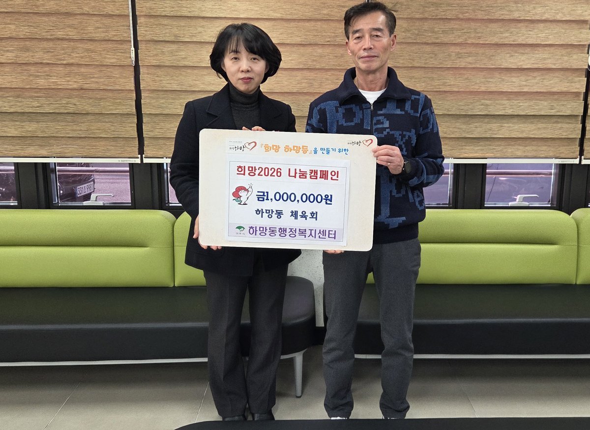 영주시 하망동 체육회가 지난 12일, 지역 내 어려운 이웃을 돕기 위한 '희망2026 나눔캠페인'에 동참하며 훈훈한 소식을 전했다.하망동 체육회는 회원들의 따뜻한 마음을 모아 성금을 기탁하며 나눔 문화 확산에 앞장섰다. 이번 성금은 추운 겨울, 소외된 이웃들에게 작은 희망을 전달하고자 마련됐다.고재규 하망동 체육회장은 “회원들과 함께 모은 성금이 지역의 어려운 이웃들에게 의미 있게 사용될 수 있어 기쁘다”며 소감을 밝혔다. 그는 이어 “작은 정성이지만, 추운 겨울을 맞아 어려움을 겪는 이웃들에게 따뜻한 온기가 되기를 바란다”고 덧붙였다.박미선 하망동장은 어려운 경제 상황 속에서도 나눔 캠페인에 참여해 준 하망동 체육회에 감사의 뜻을 전했다. 박 동장은 “기탁된 성금은 사회복지공동모금회를 통해 도움이 필요한 대상자에게 투명하게 전달될 수 있도록 최선을 다하겠다”고 약속했다.하망동은 앞으로도 지역 복지 향상을 위해 다양한 기부 활동과 나눔 실천을 지속적으로 추진할 계획이다. 이번 하망동 체육회의 참여는 지역 사회에 따뜻한 나눔 문화를 확산시키는 데 크게 기여할 것으로 기대된다. -