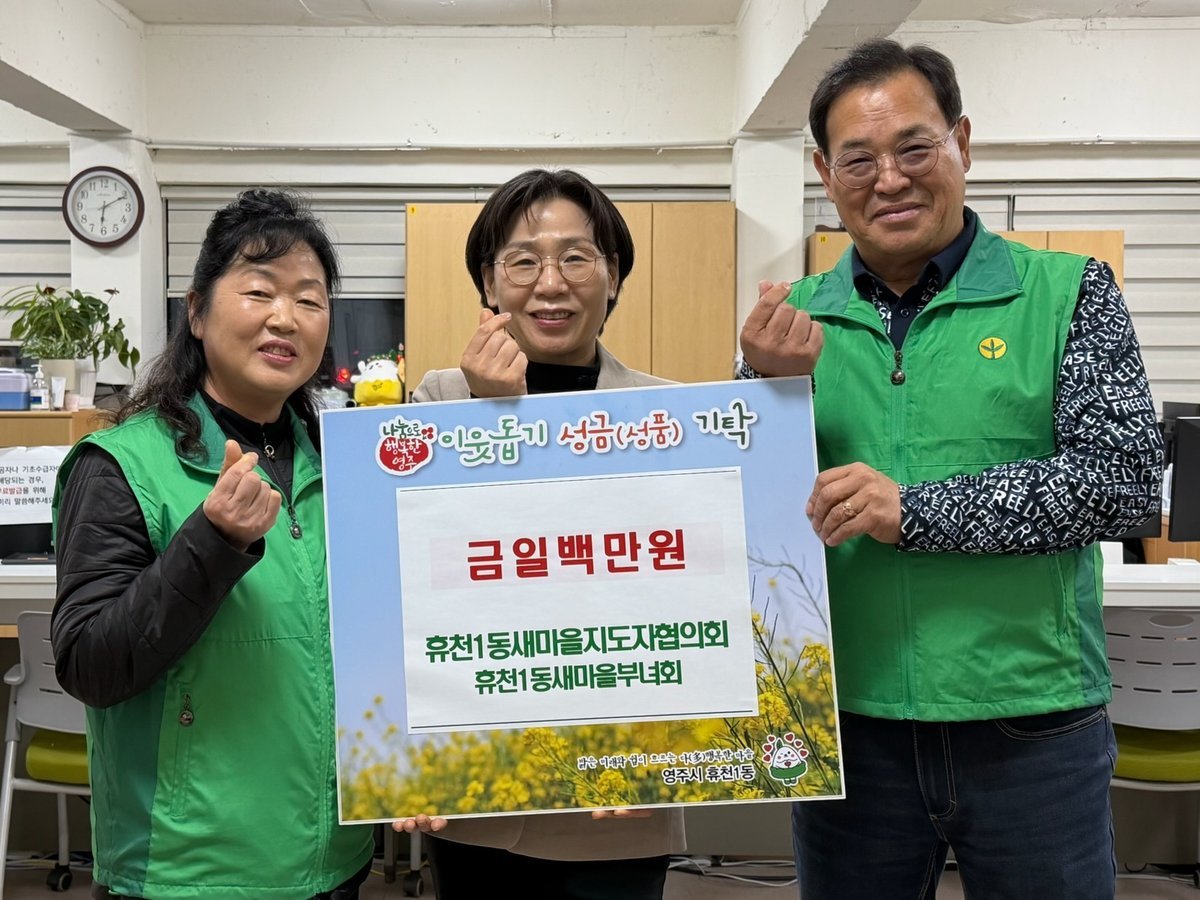 영주시 휴천1동 새마을지도자협의회와 새마을부녀회는 지난 11일 어려움이 있는 이웃들을 위해 사용해 달라며 후원금 100만 원을 휴천1동 지역사회보장협의체에 전달했다.휴천1동 새마을지도자협의회와 새마을부녀회는 지역내 예쁜 꽃길조성, 원당천 환경정비, 인도변 쓰레기 수거 및 환경정비에 힘쓰고 지난 7월에는 초복맞이 삼계탕 나눔행사도 진행하는 등 다양한 봉사활동을 해나가고 있다.박정수 새마을지도자협의회장은 “추워지는 날씨에 힘들 이웃에게 작은 위로가 되길 바라며 앞으로도 새마을부녀회와 합심하여 따뜻한 휴천1동을 만들도록 노력하겠다”고 전했다.남순남 새마을부녀회장은 “다방면으로 봉사에 힘써주시는 회원분들께 감사드리며 앞으로도 회원들과 뜻을 모아 살기 좋은 휴천1동을 만들어 가는데 힘쓰겠다”고 전했다.이날 전달된 후원금은 사회복지공동모금회를 통해 관내 어려운 이웃을 돕기 위한 사업에 사용될 예정이다. -