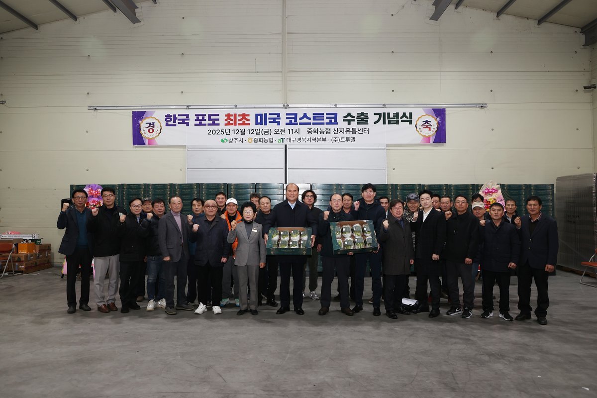 상주시 중화농협이 샤인머스캣을 미국 코스트코에 수출하는 쾌거를 이뤘다.화서면 중화농협 농산물산지유통센터에서 미국 수출 선적식을 개최하며 본격적인 미국 시장 공략에 나섰다.이번 수출은 중화농협이 미국 대형 유통업체인 코스트코와 체결한 대규모 계약의 결실이다. 40피트 컨테이너 22대 분량의 샤인머스캣이 미국으로 향한다.수출 물량은 11월 중순부터 순차적으로 선적되어 12월까지 미국 현지 코스트코 매장에서 판매될 예정이다. 이번 성과는 상주 샤인머스캣의 뛰어난 품질과 안정적인 수출 인프라를 입증하는 계기가 되었다.중화농협은 이번 샤인머스캣 수출을 통해 2025년 연간 수출액 300만 달러를 돌파하는 기록을 세웠다. 이는 상주 포도 수출 역사상 매우 의미 있는 성과로 평가받는다.지속적인 품질 향상 노력과 해외 시장 맞춤형 전략이 결실을 맺은 것으로 분석된다.상주시 관계자는 이번 미국 수출 성과가 농가, 농협, 수출업체, 그리고 행정의 협력으로 이루어진 결과라고 강조했다. 앞으로도 상주 포도의 수출 경쟁력 강화를 위해 행정적, 재정적 지원을 아끼지 않을 계획이라고 밝혔다.