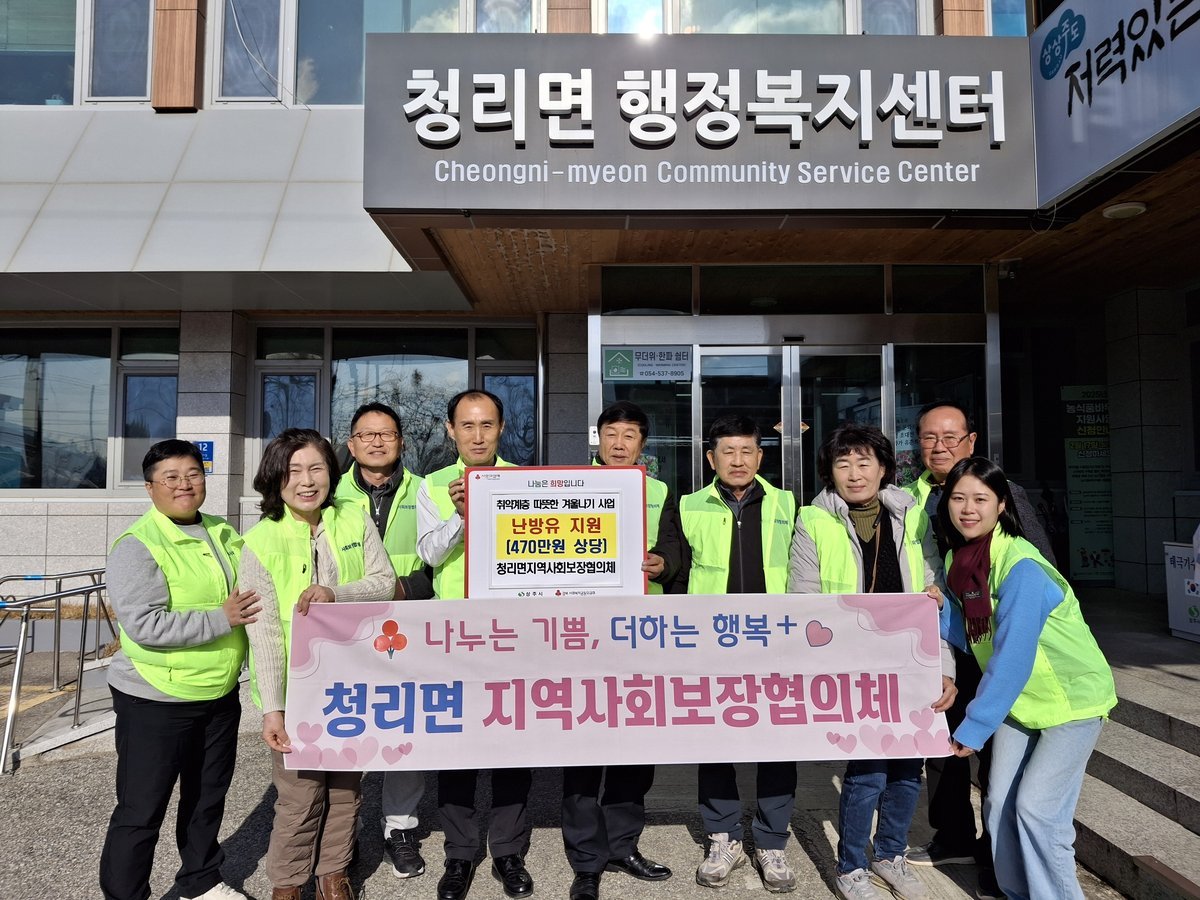 상주시 청리면지역사회보장협의체는 12월 12일 겨울철 난방비 부담으로 어려움을 겪는 저소득 취약계층을 위해 ‘겨울철 난방유 지원사업’을 실시했다.이번 지원은 경제적 여건이 취약한 가구가 한파 속에서도 최소한의 난방환경을 확보할 수 있도록 돕기 위한 것으로, 협의체는 각 마을에서 복지 사각지대에 놓인 가구를 중심으로 마을별 1명씩 총 18가구를 선정해 각각 난방유 200L 쿠폰을 지급했다.이번 사업비는 470만원 상당으로 청리면지역사회보장협의체 회원들이 자발적으로 모은 회비를 통해 마련된 것으로 알려졌다.이정길 민간위원장은 “회원들이 모은 회비로 마련된 난방유가 취약계층에게 실질적인 도움이 되길 바란다”며 “겨울철 복지사각지대를 최소화하기 위해 앞으로도 다양한 지원활동을 이어가겠다”고 말했다.공공위원장인 우광하 청리면장은 “난방비 부담이 커지는 겨울철, 작은 지원이라도 주민들에게 큰 힘이 되기를 바란다”며 “나눔 문화를 확산시키는 데 협의체가 계속 역할을 하겠다”고 전했다. -