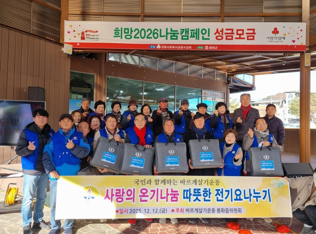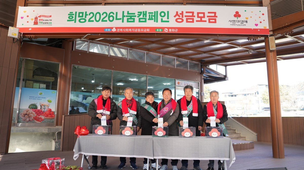 봉화읍은 연말연시 나눔 문화 확산을 위해 「희망 2026 나눔캠페인」의 핵심 행사인 이웃돕기 성금모금 행사를 2025년 12월 12일 오전 10시 봉화상설시장 무대에서 개최한다.이번 행사는 군민들이 일상 속에서 쉽게 나눔에 참여할 수 있도록 공개 모금과 ‘사랑의 열매 달아주기’퍼포먼스로 진행된다.나눔봉사단, 여성단체협의회, 경북사회복지공동모금회 등 약 100여 명이 참여한 가운데 지역 주민들과 함께 나눔 문화를 확산하기 위해 추진된다.취약계층 지원을 위한 지역 나눔 분위기를 조성하고, 군민의 따뜻한 참여를이끌어낼 수 있을 것으로 기대하고 있다.김규하 봉화읍장은 “이번 나눔캠페인은 어려운 이웃에게 실질적인 힘을 전달하기 위한 소중한 자리”라며 “봉화군은 캠페인을 시작으로 내년 1월 말까지 지속적인 모금 활동을 이어가고, 도움이 필요한 분들께 필요한 지원이 신속하게 전달될 수 있도록 다양한 나눔 프로그램을 적극 추진하겠다. 군민 여러분의 따뜻한 참여가 더 큰 희망을 만든다”고 전했다 -