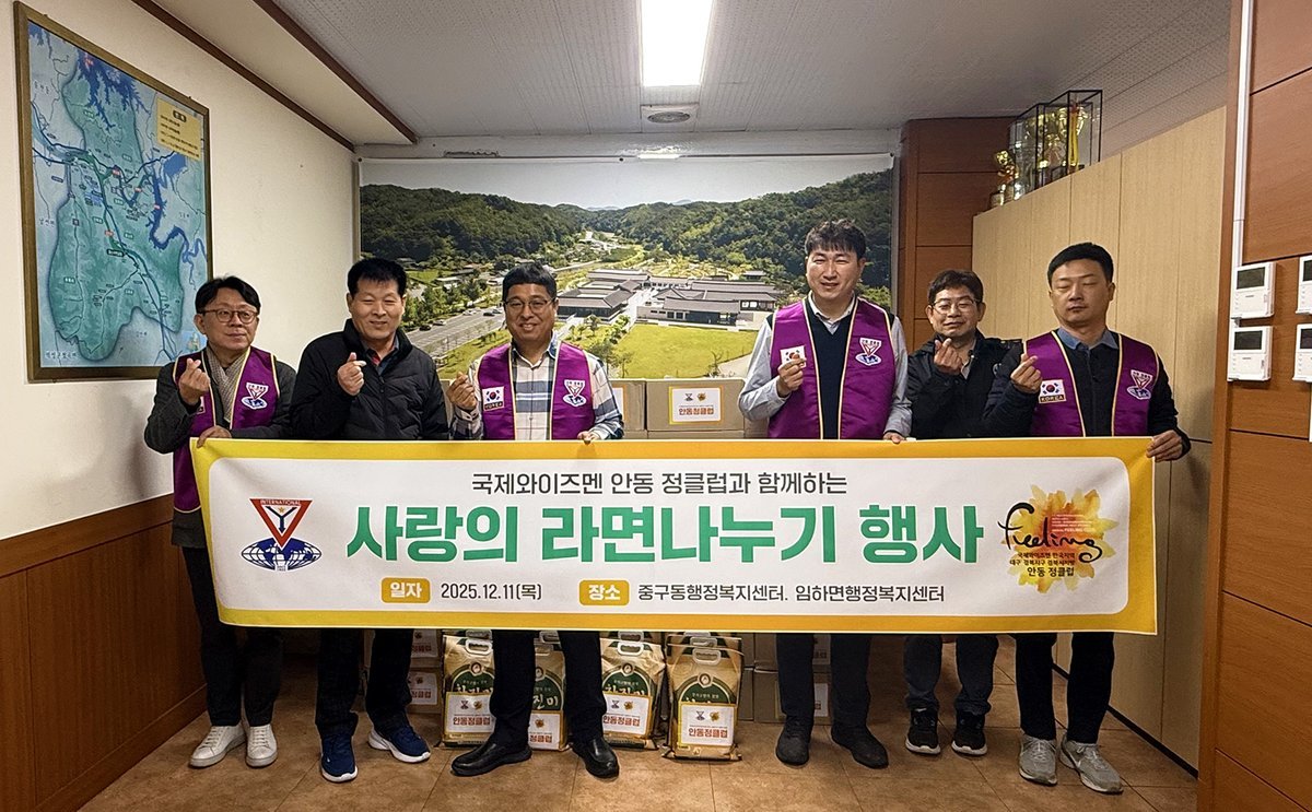국제 와이즈멘 대경지구 안동정클럽은 연말을 맞아 12월 11일 라면 30박스, 쌀 3kg 14포를 관내 소외된 이웃들을 위해 사용해달라며 임하면행정복지센터에 기부했다.이번에 전달된 후원물품은 복지 사각지대에 있는 지역주민 및 저소득 취약계층 등 지원이 필요한 가구에 배부되며, 추운 겨울을 보내는 이웃들에게 따뜻한 정을 전하는 데 사용될 예정이다.국제 와이즈멘 대경지구 안동정클럽은 소외된 이웃을 돕기 위한 지속적인 봉사와 나눔을 실천하고 있으며, 연탄 나눔․후원금 전달 등 지역사회를 위한 따뜻한 선행을 꾸준히 이어 오고 있다.한동희 대표는 “작지만 의미 있는 나눔이 어려운 이웃들에게 도움이 되길 바란다”며 “국제 와이즈멘 대경지구 안동정클럽은 앞으로도 지역사회와 함께하는 봉사와 나눔 활동을 꾸준히 이어가겠다”고 밝혔다.송정훈 면장은 “연말을 맞아 따뜻한 손길을 전해주신 클럽 회원들께 감사드린다”며 “기탁된 물품은 도움이 필요한 취약계층 주민들에게 신속하게 전달될 수 있도록 최선을 다하겠다”고 말했다. -