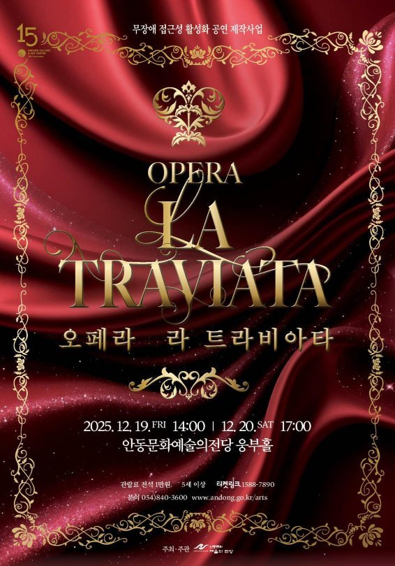 안동문화예술의전당이 장애인과 비장애인 모두가 함께 즐길 수 있는 무장애 접근성 공연, 오페라 '라 트라비아타'를 선보인다.이번 공연은 12월 19일 오후 2시와 20일 오후 5시, 안동문화예술의전당 웅부홀에서 총 2회에 걸쳐 진행된다.이번 공연은 단순히 보는 공연을 넘어, 모든 관객이 불편함 없이 예술을 경험할 수 있도록 다양한 무장애 서비스를 제공하는 것이 특징이다. 시각 장애인을 위한 점자 리플렛과 촉각 전시, 청각 장애인을 위한 자막과 수어 통역이 제공된다. 또한, 로비에는 접근성 매니저가 상주하여 관람을 돕는다.특히, 안동시와 경북 지역 장애인 단체를 초청하여 무료 관람 기회를 제공, 문화 향유 기회를 넓히는 데 기여한다.'라 트라비아타'는 베르디의 대표작으로 뒤마의 '동백꽃 여인'을 원작으로 한다. 비올레타와 알프레도의 비극적인 사랑을 통해 희생과 편견, 진정한 사랑의 의미를 되새기게 한다.이번 공연에는 소프라노 마혜선, 테너 정호윤, 바리톤 한명원 등 국내 정상급 성악가들이 출연하며, 디오오케스트라와 안동시립합창단이 함께 풍성한 무대를 꾸민다. 음성해설은 심정옥, 수어해설은 정순희·강병규가 맡아 공연의 완성도를 높일 예정이다.'라 트라비아타'는 전석 1만 원이며, 5세 이상 관람 가능하다. 예매 및 자세한 정보는 안동문화예술의전당 홈페이지 또는 전화를 통해 확인할 수 있다. -