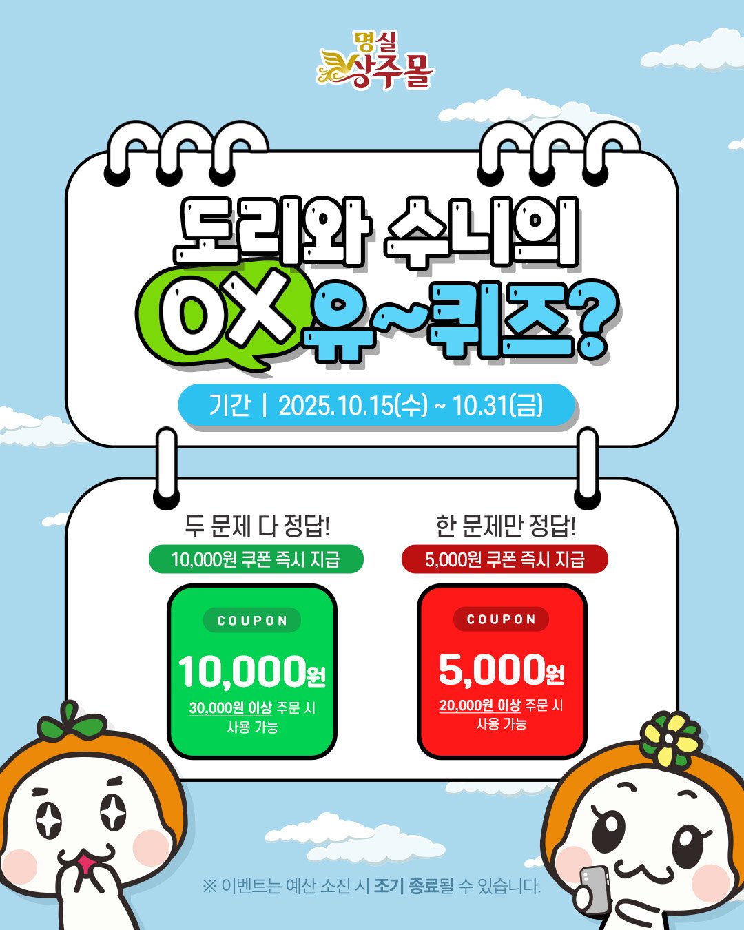 상주시가 운영하는 농특산물 온라인 쇼핑몰 명실상주몰이 시민과 소비자들의 참여를 유도하고 상주 농산물의 우수성을 알리기 위해 특별한 퀴즈 이벤트를 진행한다.이번 행사는 상주시 공식 캐릭터인 '도리&...