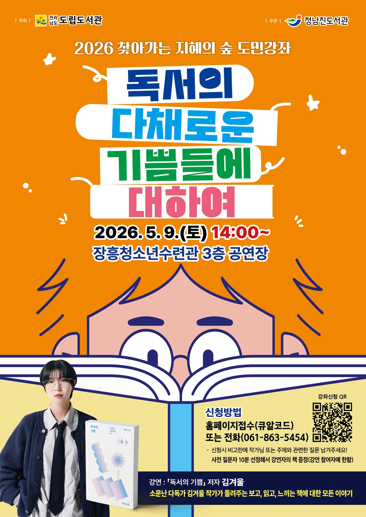 노벨문학도시 장흥군이 책을 매개로 군민과 소통하는 인문학 프로그램을 마련했다.장흥군 정남진도서관은 오는 5월 9일 오후 2시 장흥청소년수련관 공연장에서 북튜버이자 작가인 김겨울을 초청해 ‘2026년 찾아가...
