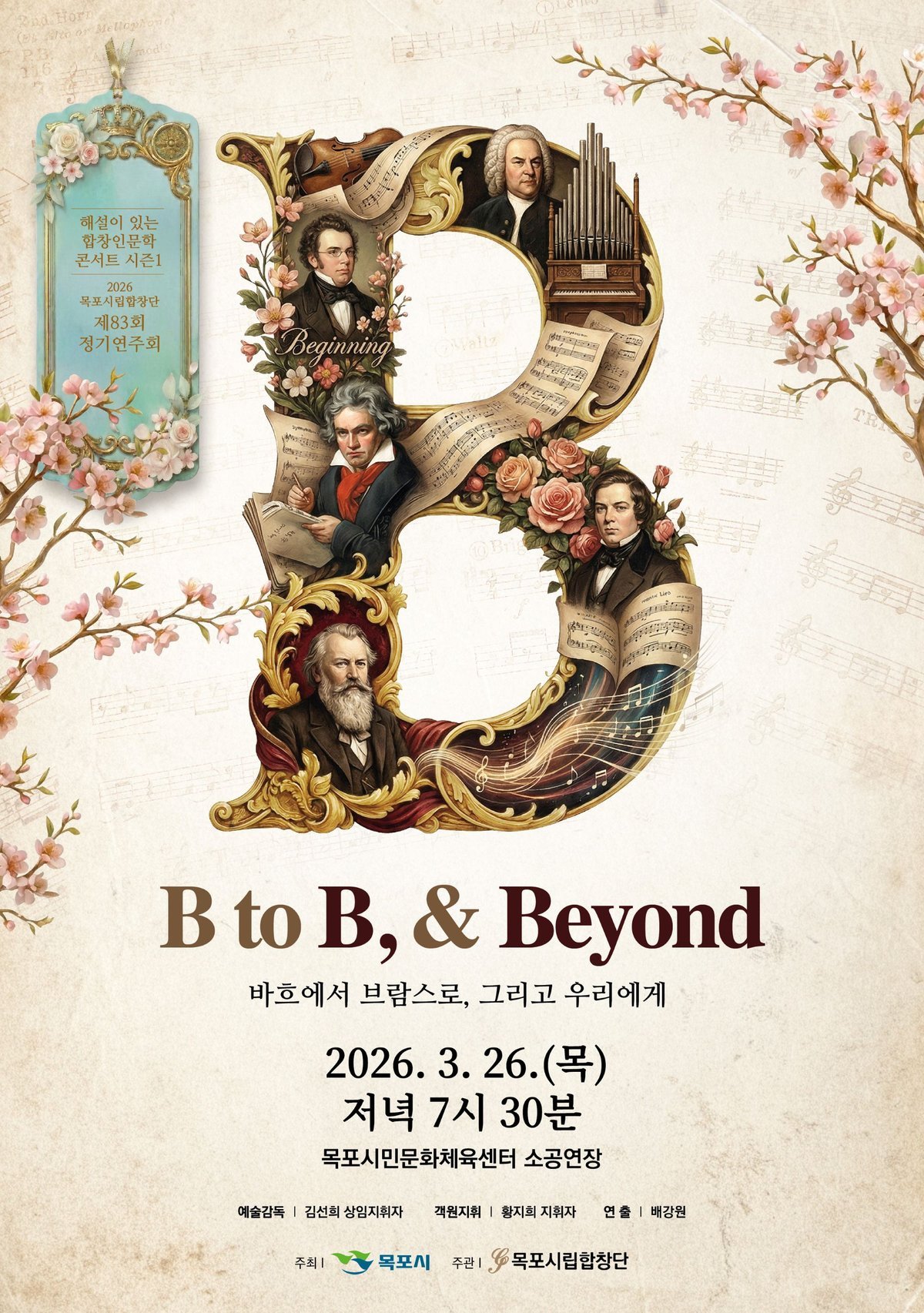 목포시립합창단이 오는 3월 26일 오후 7시 30분, 목포시민문화체육센터 소공연장에서 제83회 정기연주회 ‘B to B Beyond : 해설이 있는 합창인문학콘서트 시즌1’을 개최한다.이번 공연은 서양 음악사를 빛낸 거장들의 이름 앞 글자 ‘B’를 테마로 바로크의 요한 제바스티안 바흐부터 고전주의의 루트비히 판 베토벤, 낭만주의의 프란츠 슈베르트와 로베르트 슈만, 요하네스 브람스에 이르기까지 시대를 아우르는 입체적인 음악 여정을 선보인다.더 나아가 현대 한국 창작 합창으로 확장되는 ‘Beyond’무대를 통해 과거와 현재를 잇는 특별한 감동을 전할 예정이다.공연의 문은 바흐의 양들은 평온히 풀을 뜯으리 와 베토벤의 아델라이데 로 연다.평화로운 목가적 선율과 낭만주의 가곡의 출발을 알린 작품을 통해 깊이 있는 서정성을 선사한다.이어지는 무대에서는 낭만주의 가곡의 정수라 불리는 슈베르트와 슈만의 작품을 만나볼 수 있다.독일예술가곡 전문해설사이자 객원지휘자인 황지희가 전문적이고 깊이 있는 해설을 곁들여, 시와 음악이 완벽하게 결합된 독일 가곡 특유의 사랑과 환희, 그리움의 감정을 섬세하게 전달할 예정이다.후반부는 브람스의 집시의 노래 로 장식된다.합창 특유의 풍성한 화성과 역동적인 리듬이 어우러져 강렬한 카타르시스를 선사할 것으로 기대된다.특히 공연의 대미를 장식하는 ‘Beyond’스테이지에서는 목포 출신 김수형 시인의 시에 이범준 작곡가가 곡을 붙인 창작 합창 가곡 ‘목포역’이 초연된다.지역의 삶과 애환, 문학적 자산이 아름다운 합창으로 피어나는 이번 무대는 위대한 음악 유산이 오늘의 목포로 이어지는 상징적 의미를 더한다.김선희 지휘자는 “관객들이 프로그램북을 넘기며 서양음악사의 흐름을 자연스럽게 짚어보고 목포의 정서를 담은 초연곡 ‘목포역’까지 함께 만날 수 있는 뜻깊은 무대”며 “클래식이 어렵게 느껴졌던 관객들도 편안하게 공감하며 따뜻한 봄밤의 정취를 만끽하시길 바란다”고 전했다.공연 입장권은 일반 5000원, 학생 3000원이며 티켓링크를 통해 예매할 수 있다.