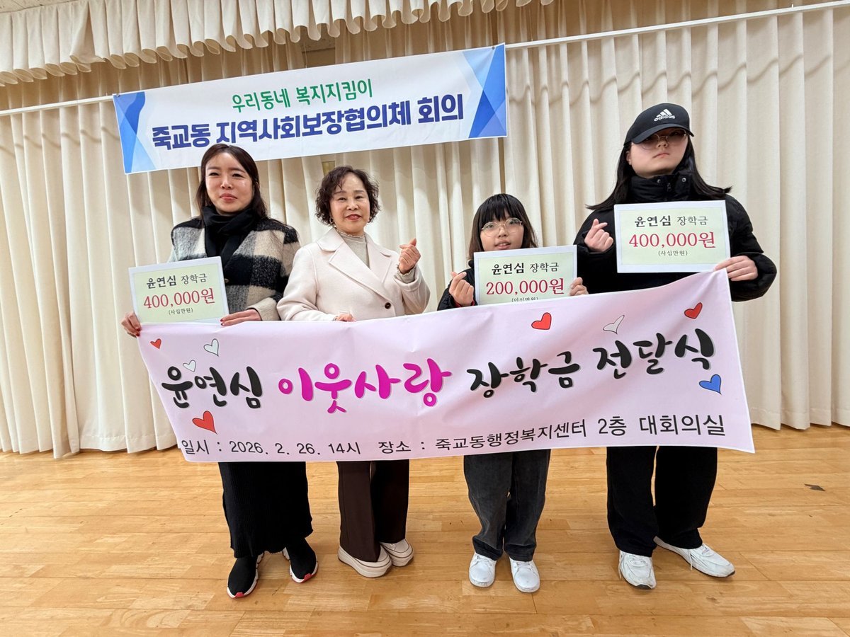 죽교동 지역사회보장협의체 윤연심 위원장이 지역 내 청소년을 위해 장학금 100만 원을 지원했다.이번 장학금은 학업에 힘쓰고 있는 청소년들을 격려하기 위해 마련됐다.윤연심 위원장은 “아이들이 자신의 가능성을 믿으며 성장하길 바라는 마음으로 작은 정성을 보탰다”고 말했다.박선미 죽교동장은 “청소년들을 위한 뜻깊은 나눔에 감사드린다”며 “아이들이 건강하게 성장할 수 있도록 지역사회와 함께 지속적인 지원을 이어가겠다”고 밝혔다.이번 장학금 지원은 지역사회에 따뜻한 나눔 문화를 확산하는 계기가 되고 있다.