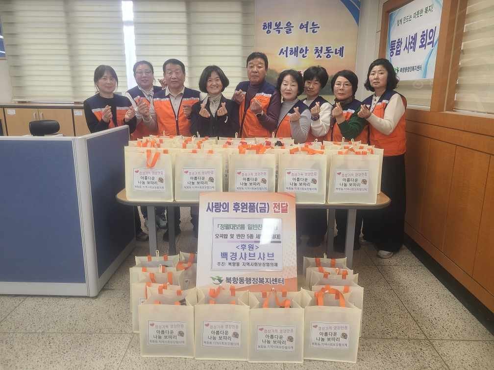 백경샤브샤브는 지난 3일 정월대보름을 맞아 북항동 행정복지센터를 찾아 오곡밥 나눔 행사를 진행했다.이날 후원 물품은 오곡밥과 시금치, 무나물, 김치, 고사리, 김 등 5종의 밑반찬으로 구성된 도시락 30세트로, 북항동 지역사회보장협의체 위원들이 각 가정을 방문해 안부를 확인하며 직접 전달했다.윤수정 대표는 “작은 정성이지만 어르신들께서 건강하고 풍요로운 한 해를 보내시는 데 보탬이 되길 바란다”고 전했다.정순양 북항동장은 “정월대보름을 맞아 이웃을 위한 나눔을 실천해 주셔서 감사드린다”며 “앞으로도 복지 사각지대 해소를 위해 지속적으로 노력하겠다”고 밝혔다.
